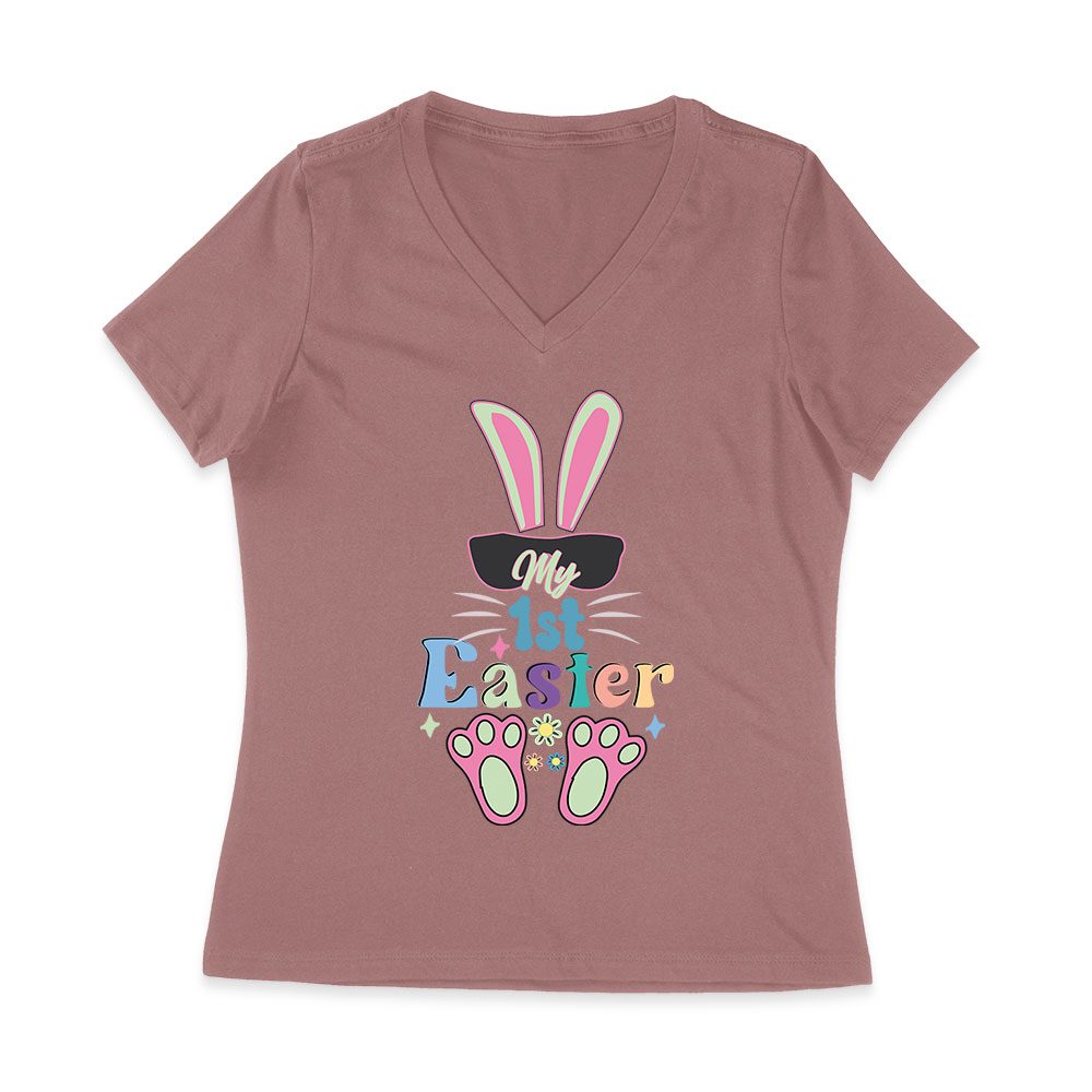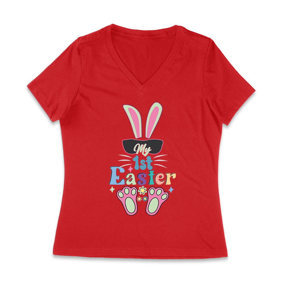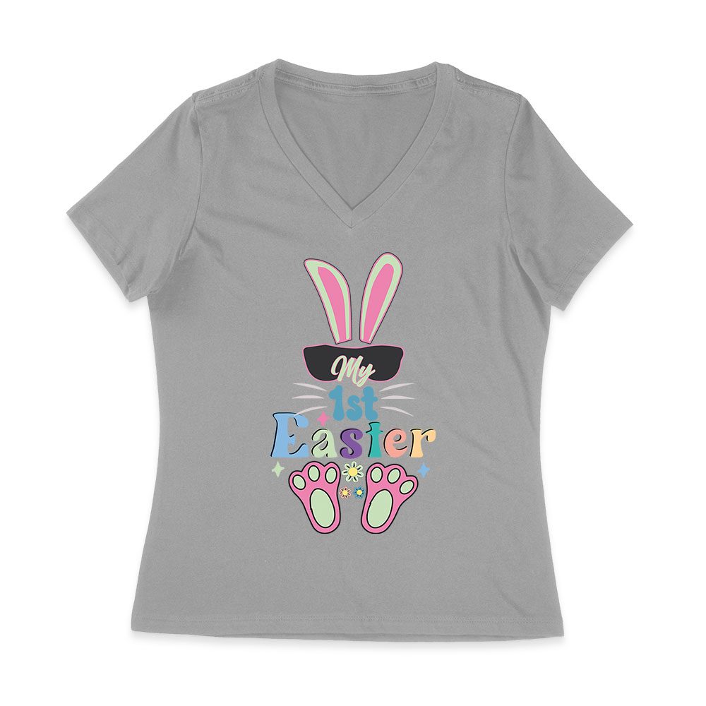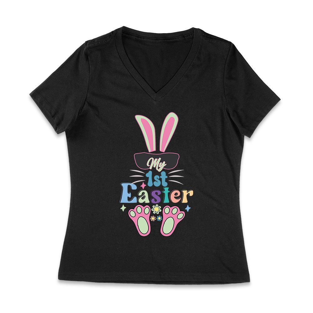 1st Easter T-Shirt – Adorable Baby?s First Easter Outfit with Cute Bunny & Colorful Eggs Women Jersey V-Neck