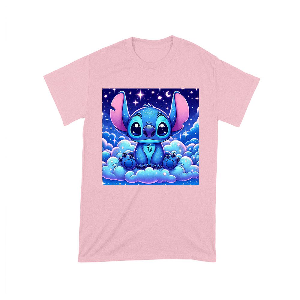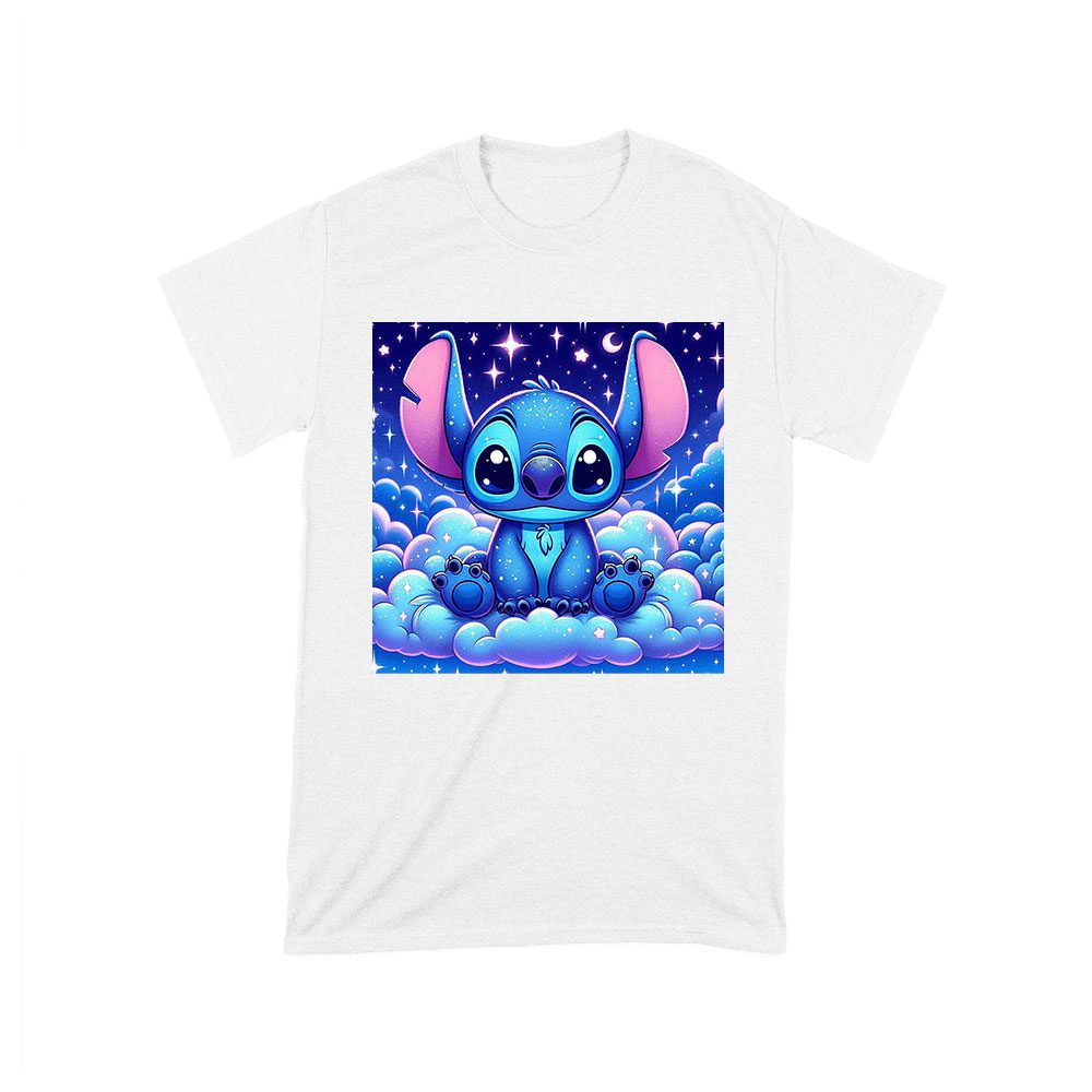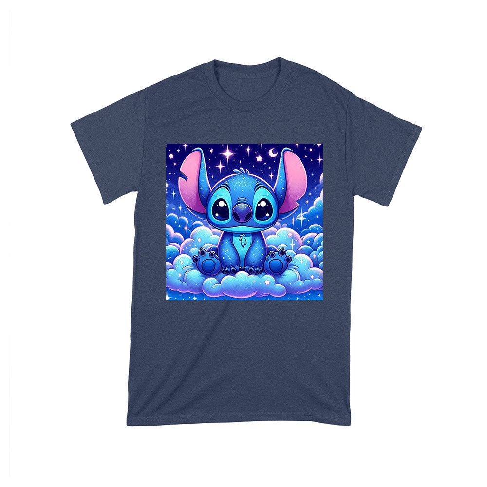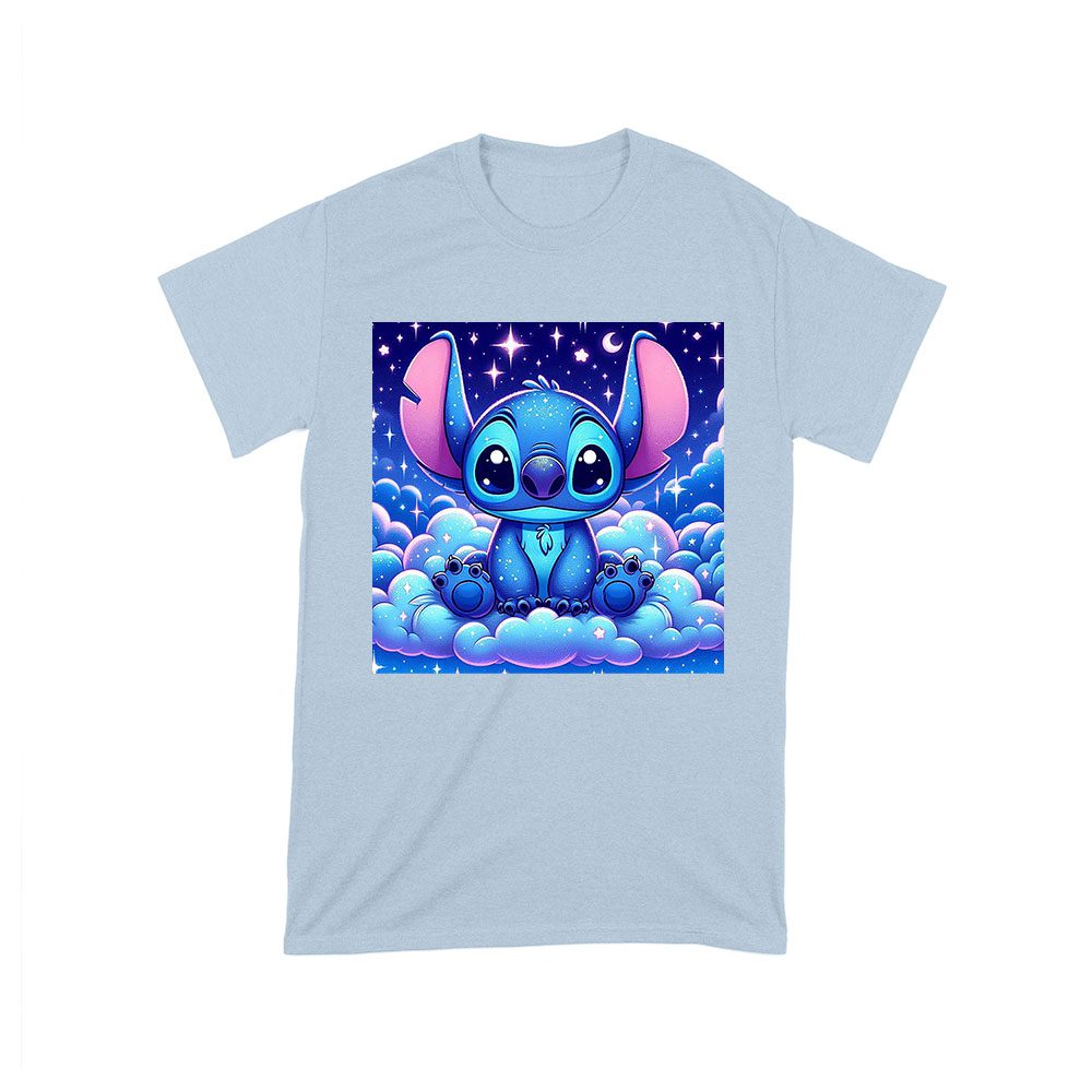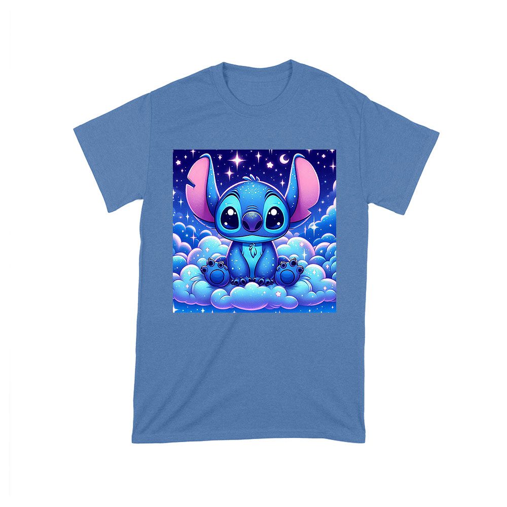 blue Stitch t-shirt, galactic blue shirt, starry night cartoon, Stitch design shirt, cute Stitch t-shirt, kids Stitch shirt, cartoon galaxy shirt, cosmic creature shirt, star-themed t-shirt, adorable Stitch wear, space-themed cartoon, Stitch night sky tee: