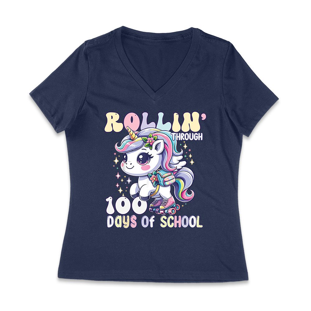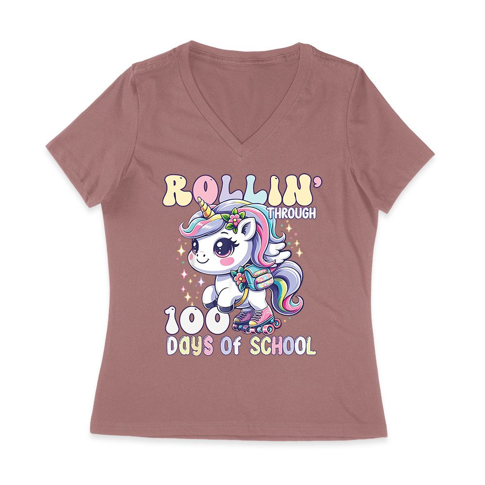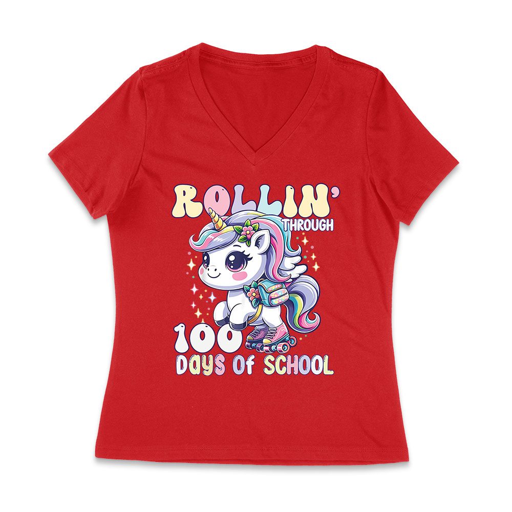 Adorable Unicorn 100 Days of School T-Shirt – Rollin’ Through Milestones with Cute Roller Skates Women Jersey V-Neck