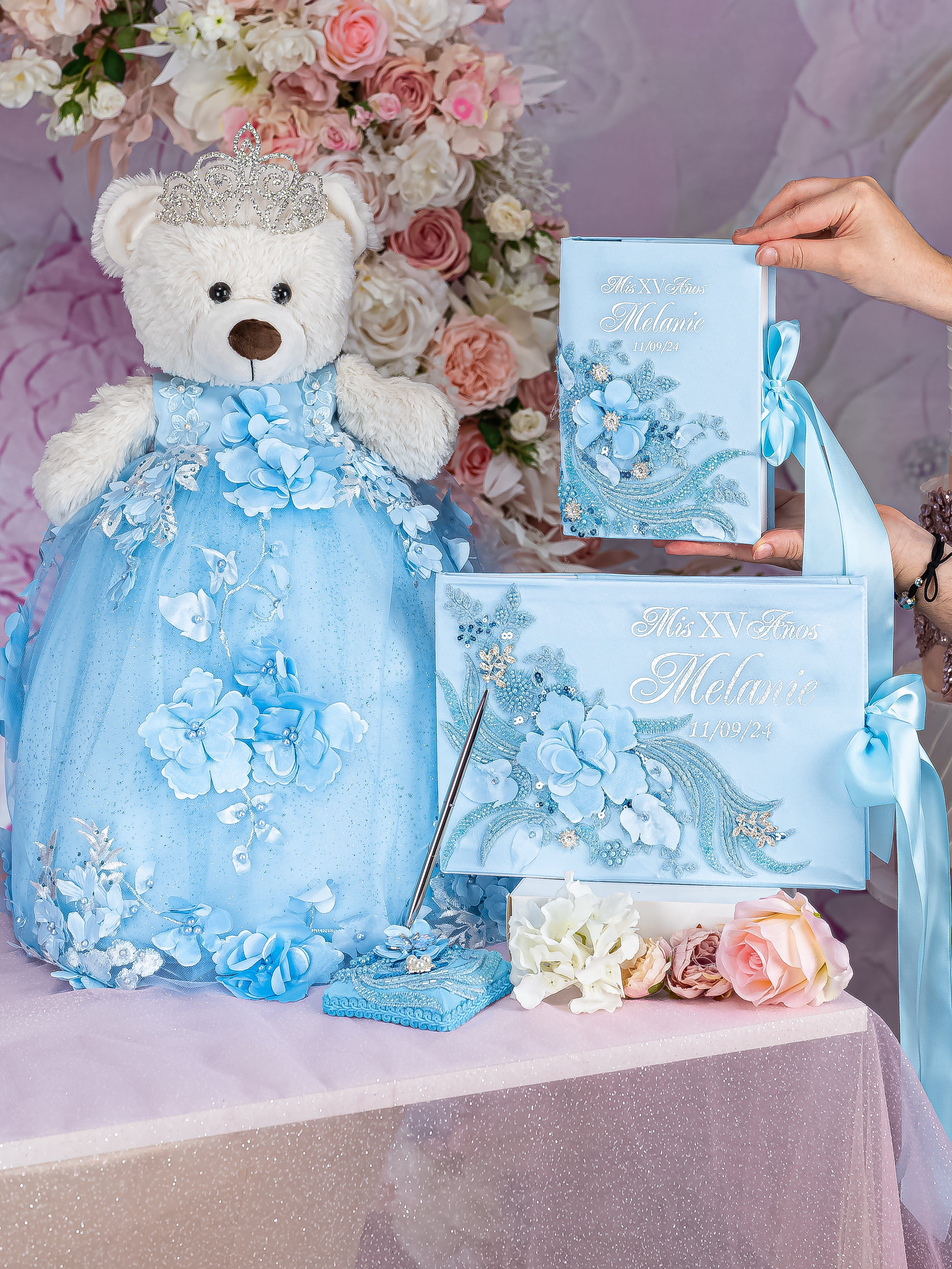 The Azul Celeste Quincea?era Package is a beautifully curated set that includes a soft teddy bear, a matching Bible, and a stylish guest book, all in a serene sky blue. This elegant package symbolizes purity and faith, making it a perfect addition to your special day.