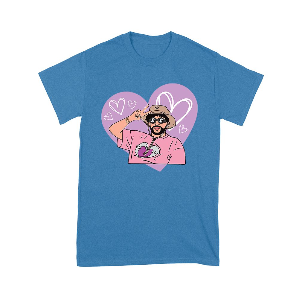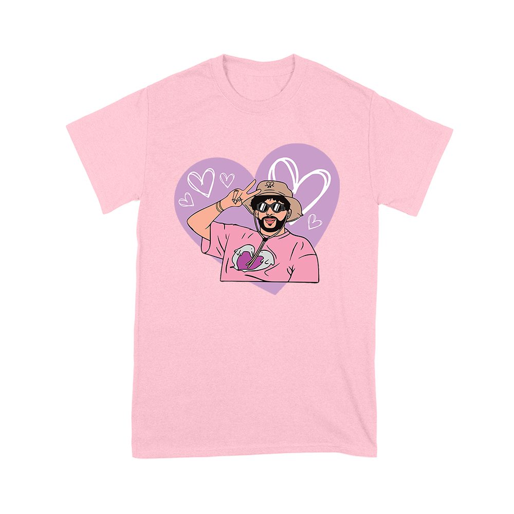 Bad-Bunny cartoon; pink heart background; Latin music graphic; reggaeton pop art; Benito illustration; Bad-Bunny artwork; heart-themed design; trendy urban style; colorful character art; Latin pop culture; fan art design; expressive pop graphic;: