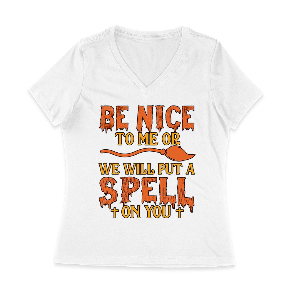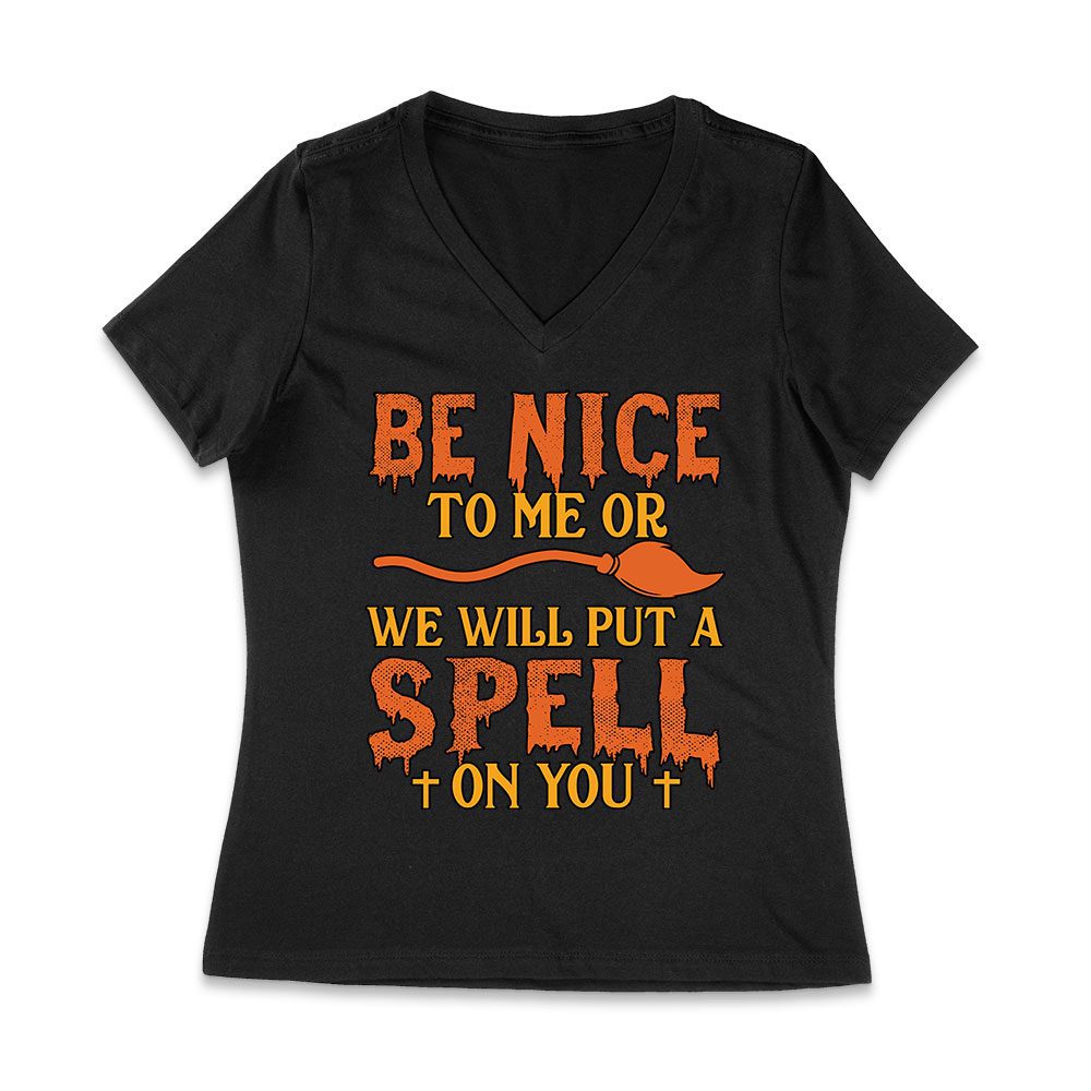 Beware! Be nice to me or we will put a spell on you – Funny Halloween Spellcaster T-Shirt Women Jersey V-Neck