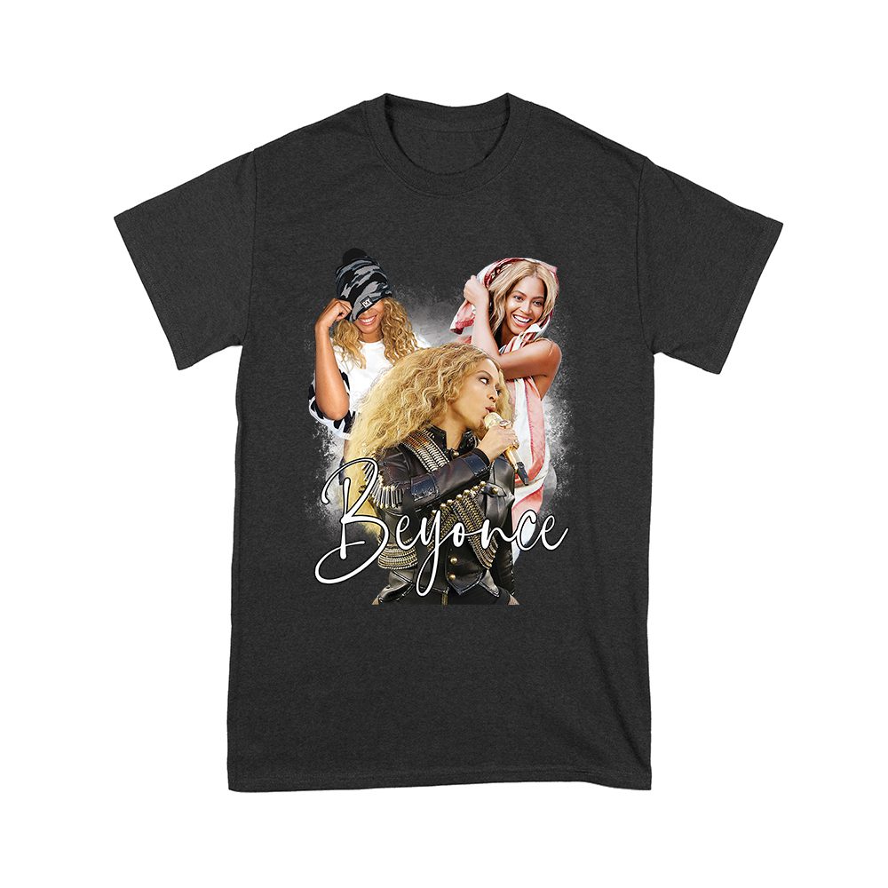 Beyonce candid photo tee; smiling diva shirt; performance close-up design; expressive queen graphic T-shirt; casual fanwear print; music star singing pose: