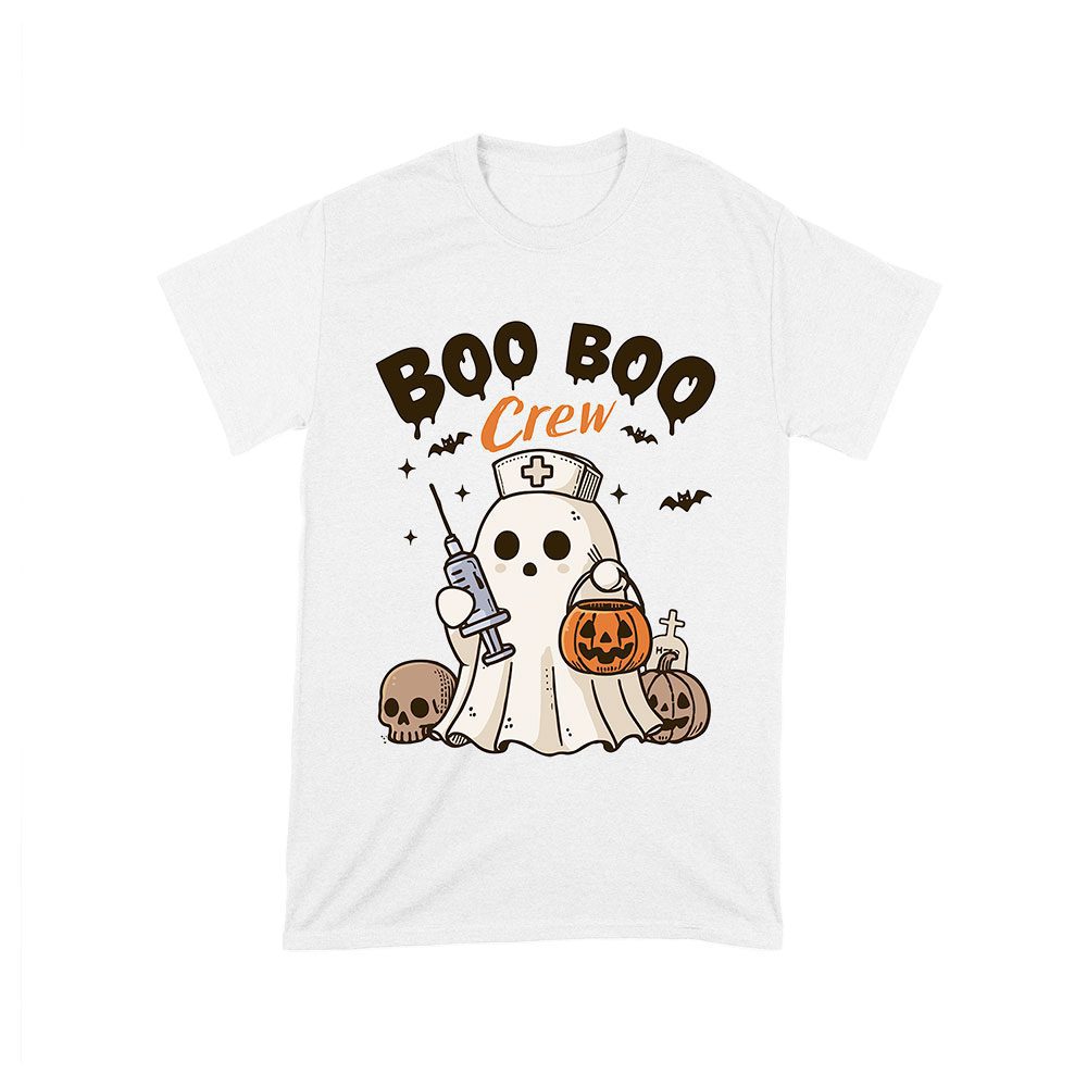 Halloween t-shirt, ghost nurse shirt, Boo Boo Crew, spooky nurse shirt, Halloween costume tee, funny Halloween shirt, nurse Halloween shirt, ghost holding syringe, creepy nurse t-shirt, spooky season tee, novelty Halloween shirt:
