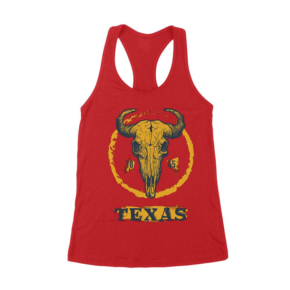 Bull Skull 1845 Texas T-Shirt – Western Cowboy Graphic Tee – Vintage Longhorn Design – Bold Wild West Style for Texas Rodeo Fans Women’s Racerback Tank Top