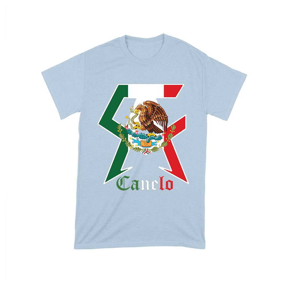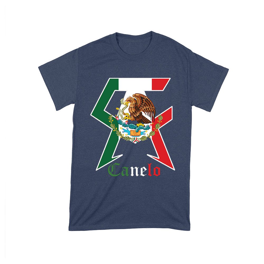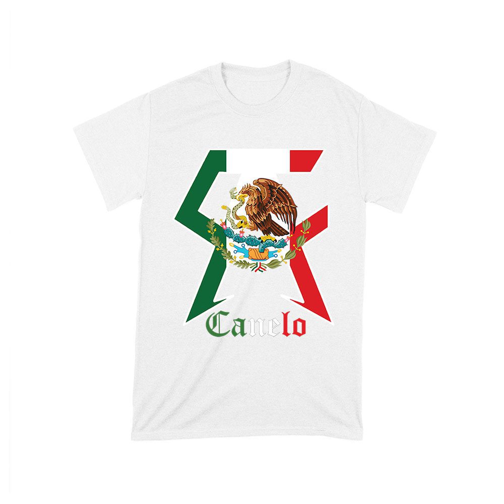 Canelo Alvarez power shirt, bold Mexican flag tee, striking C and A design, Canelo Alvarez boxing pride, dynamic Mexican colors, fierce boxing gear, Canelo Alvarez fan apparel, Mexican flag power, Alvarez boxing statement, unstoppable Canelo design: