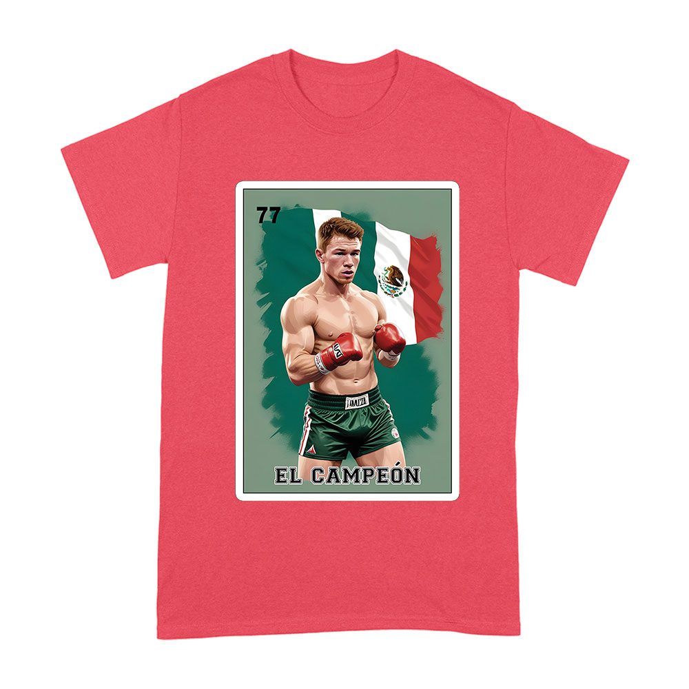 Canelo Alvarez card shirt, bold retro cartoon Canelo, Mexican flag colors, Canelo Alvarez boxing tee, dynamic card design, vibrant Mexican heritage, powerful boxing apparel, Canelo Alvarez fan gear, striking retro boxing, Alvarez Mexican pride T-shirt: