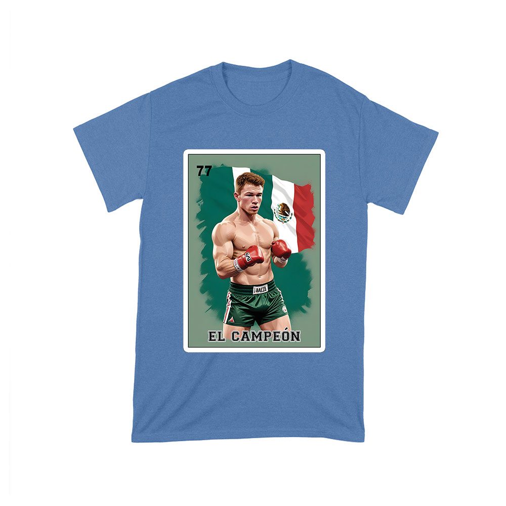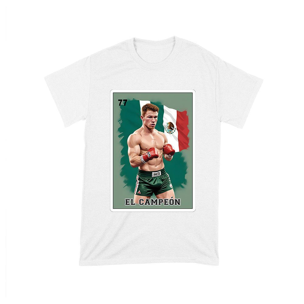 Canelo Alvarez card shirt, bold retro cartoon Canelo, Mexican flag colors, Canelo Alvarez boxing tee, dynamic card design, vibrant Mexican heritage, powerful boxing apparel, Canelo Alvarez fan gear, striking retro boxing, Alvarez Mexican pride T-shirt: