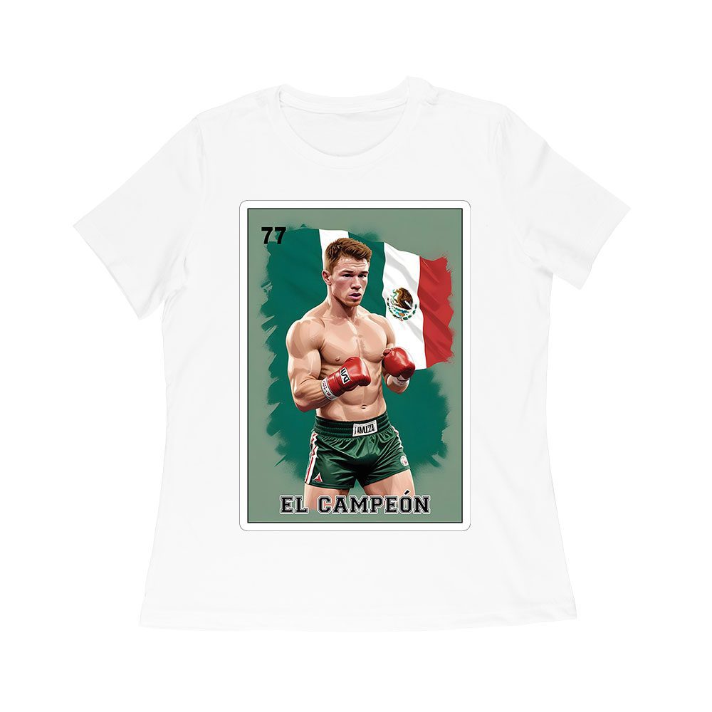 Canelo Alvarez Card T-Shirt – Bold Retro Cartoon with Mexican Flag Colors Women Relaxed