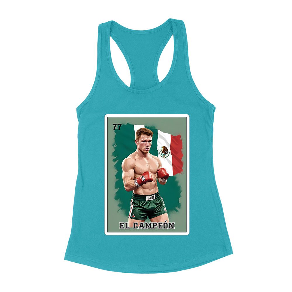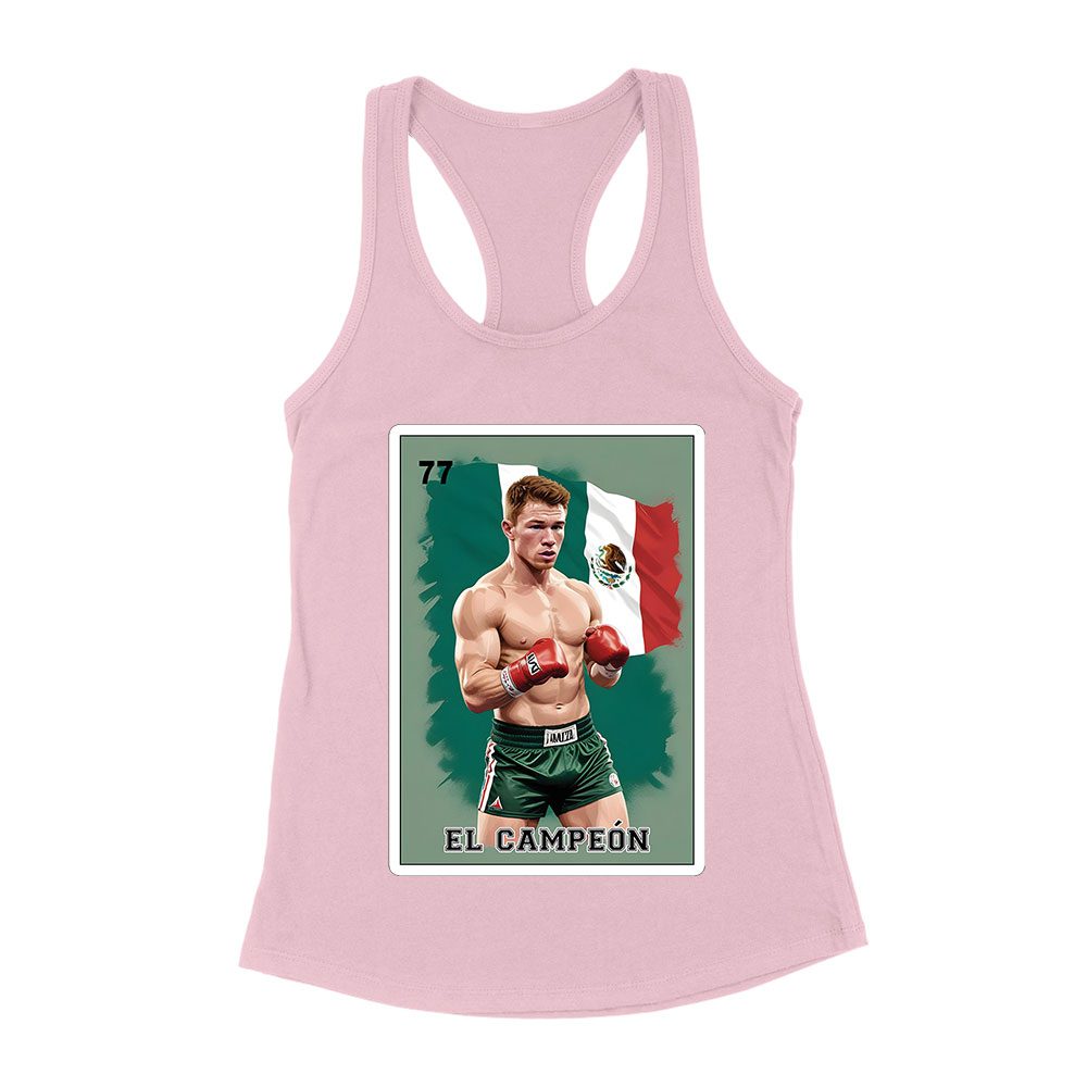 Canelo Alvarez Card T-Shirt – Bold Retro Cartoon with Mexican Flag Colors Women’s Racerback Tank Top