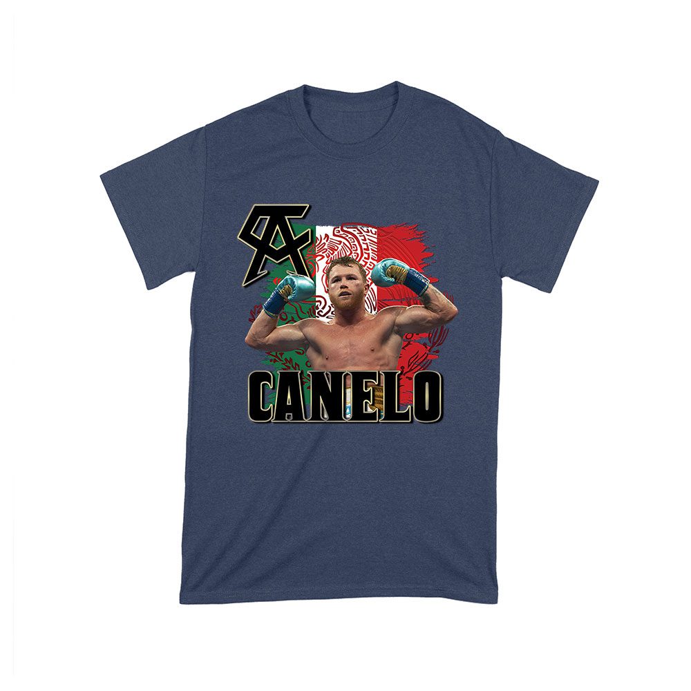 Canelo Alvarez image shirt, Mexican flag background, powerful boxing tee, Canelo Alvarez design, iconic Mexican pride, boxing legend apparel, Canelo Alvarez fan gear, bold flag and image, Alvarez boxing tribute, fierce Canelo T-shirt: