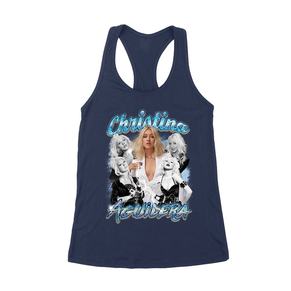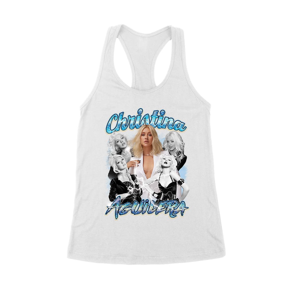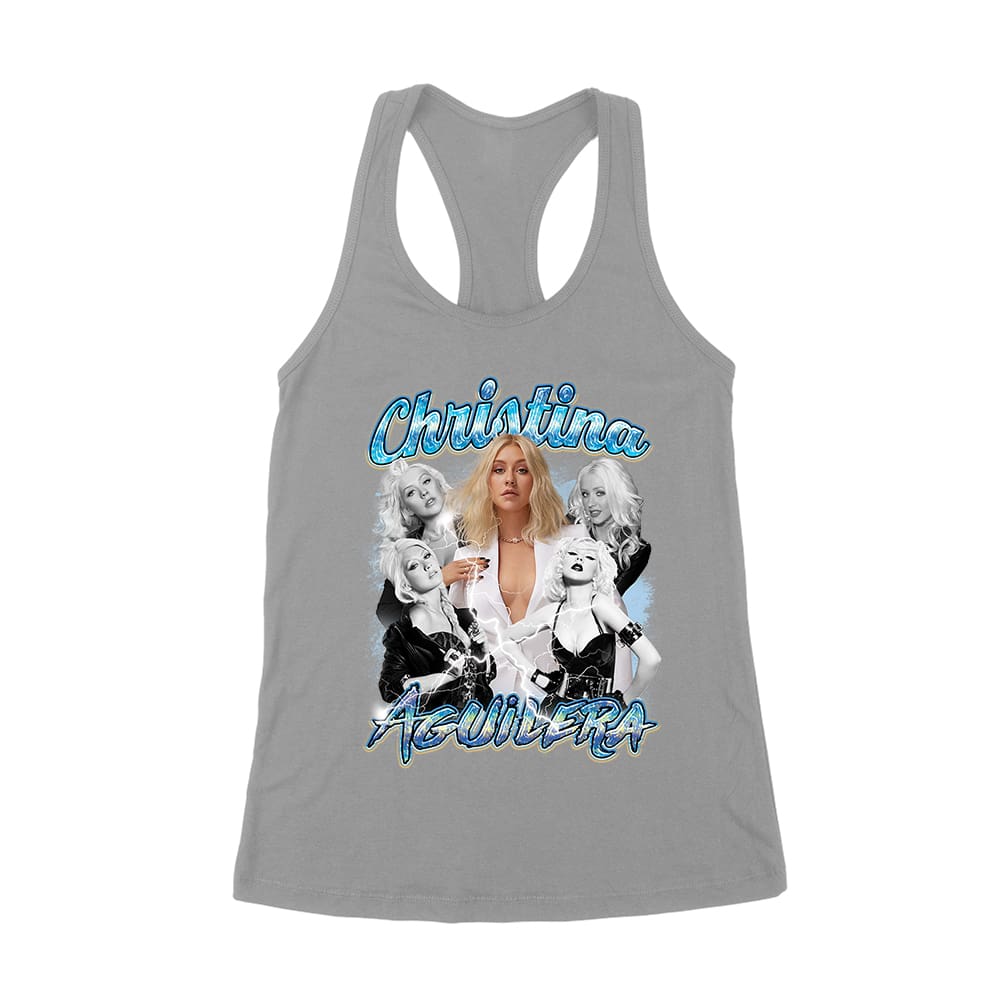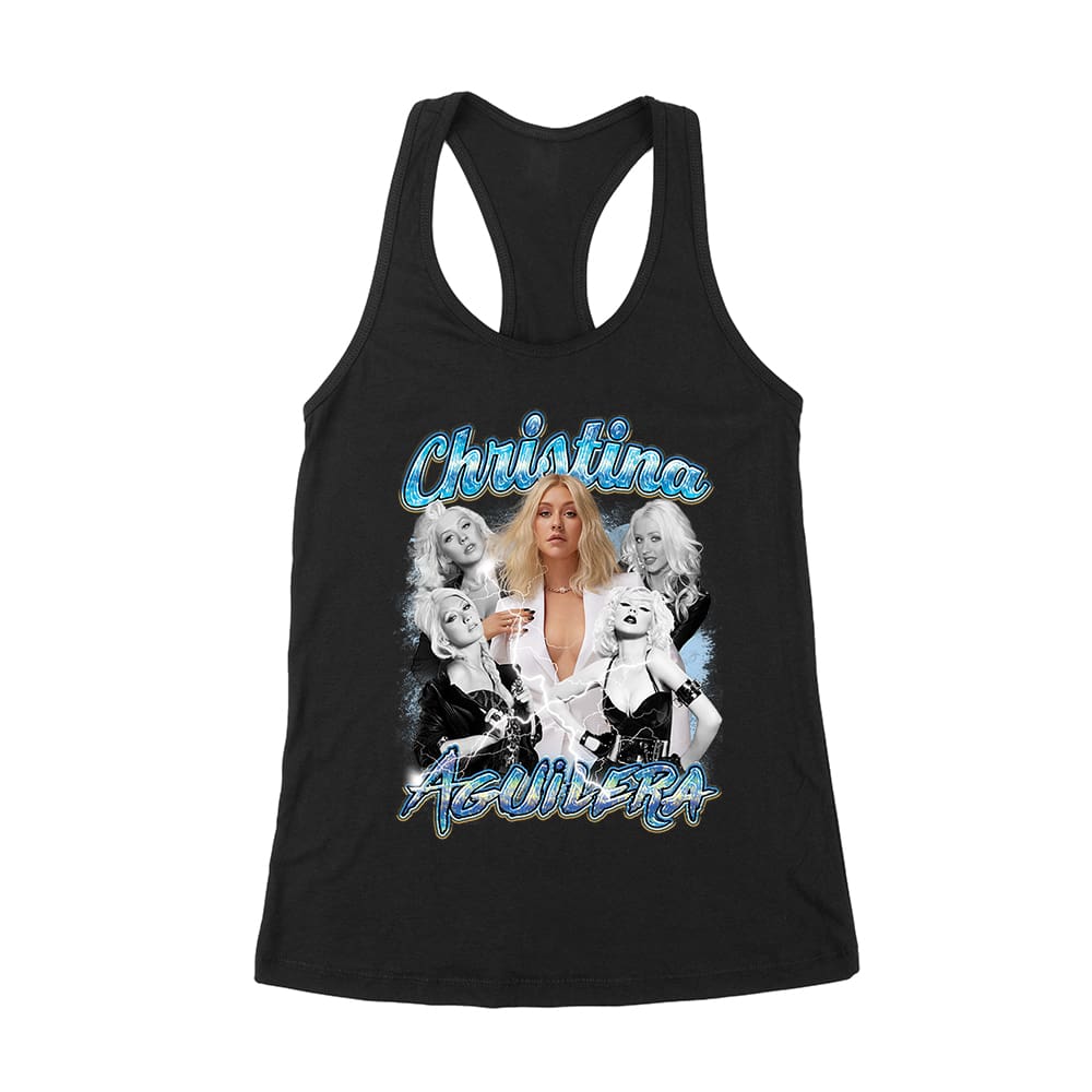 Christina Aguilera Grayscale Collage T-Shirt with Blue Name Highlight Women’s Racerback Tank Top