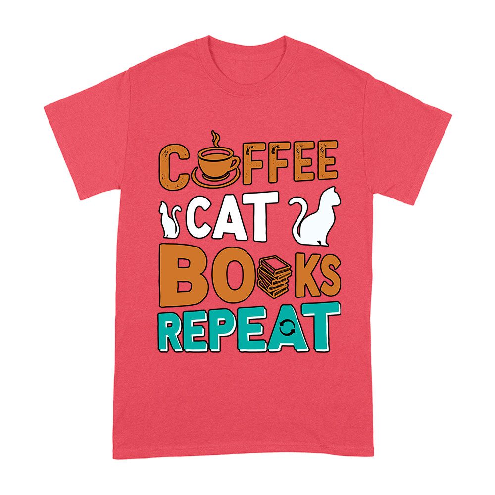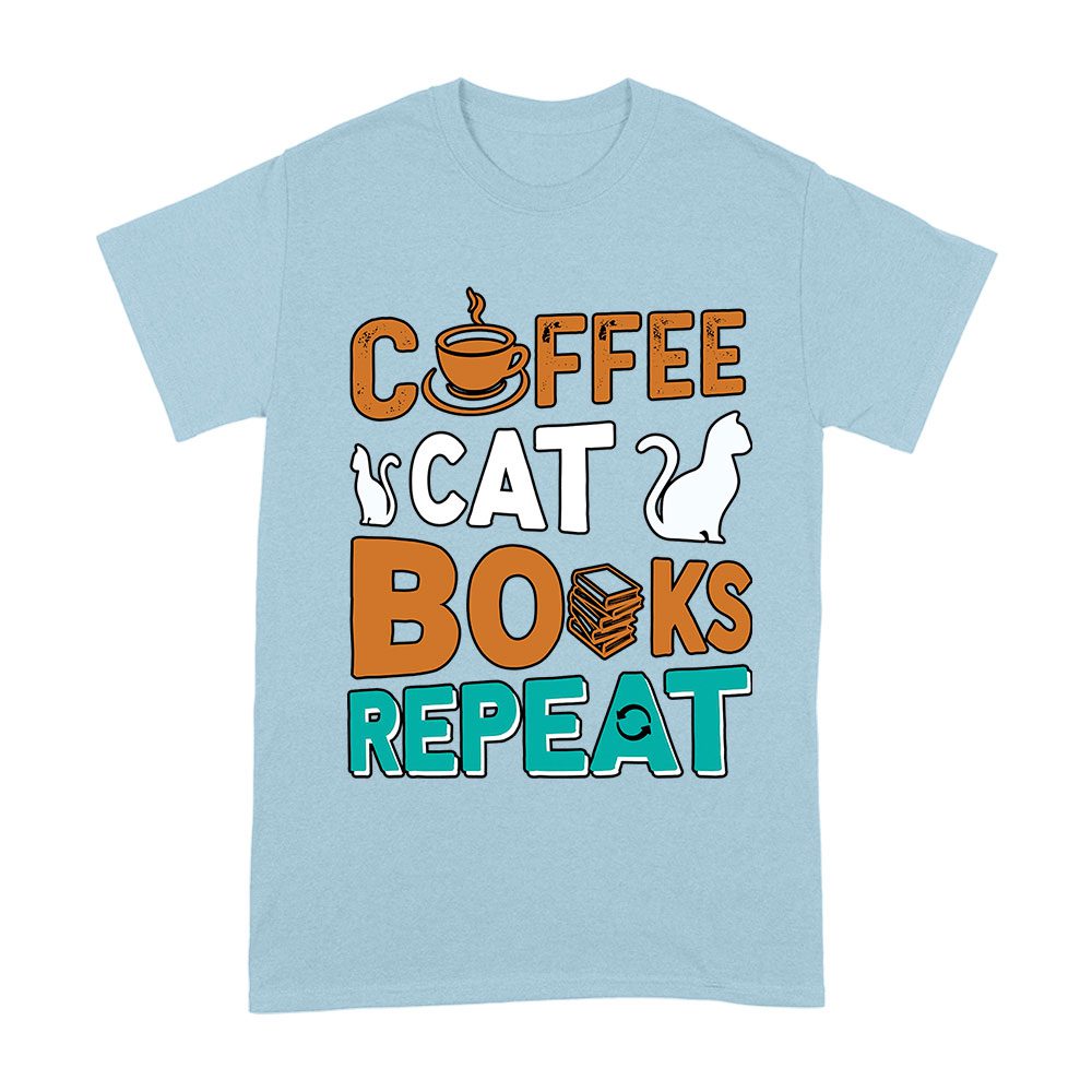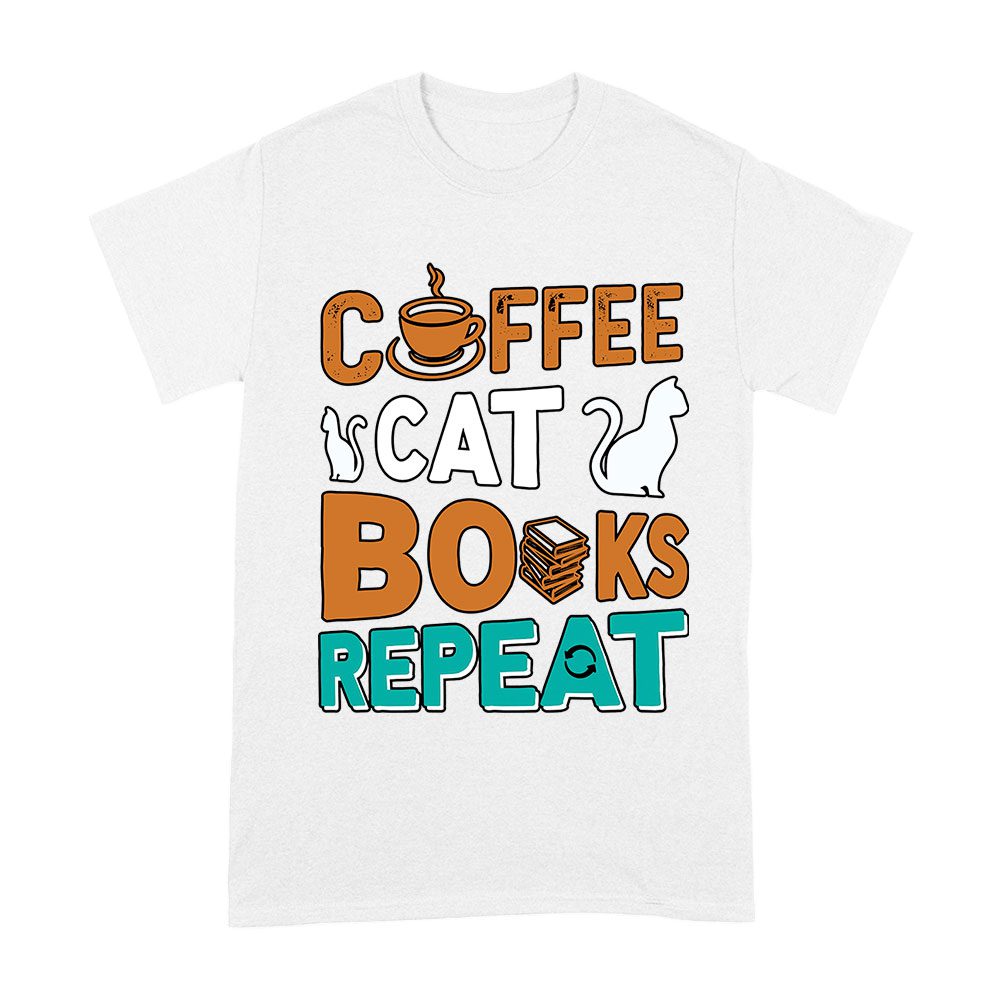 Coffee Cat Books Repeat T-Shirt – Cozy Book Lover Tee for Readers, Cat Owners, Caffeine Addicts, Literary Fans, and Relaxation Enthusiasts