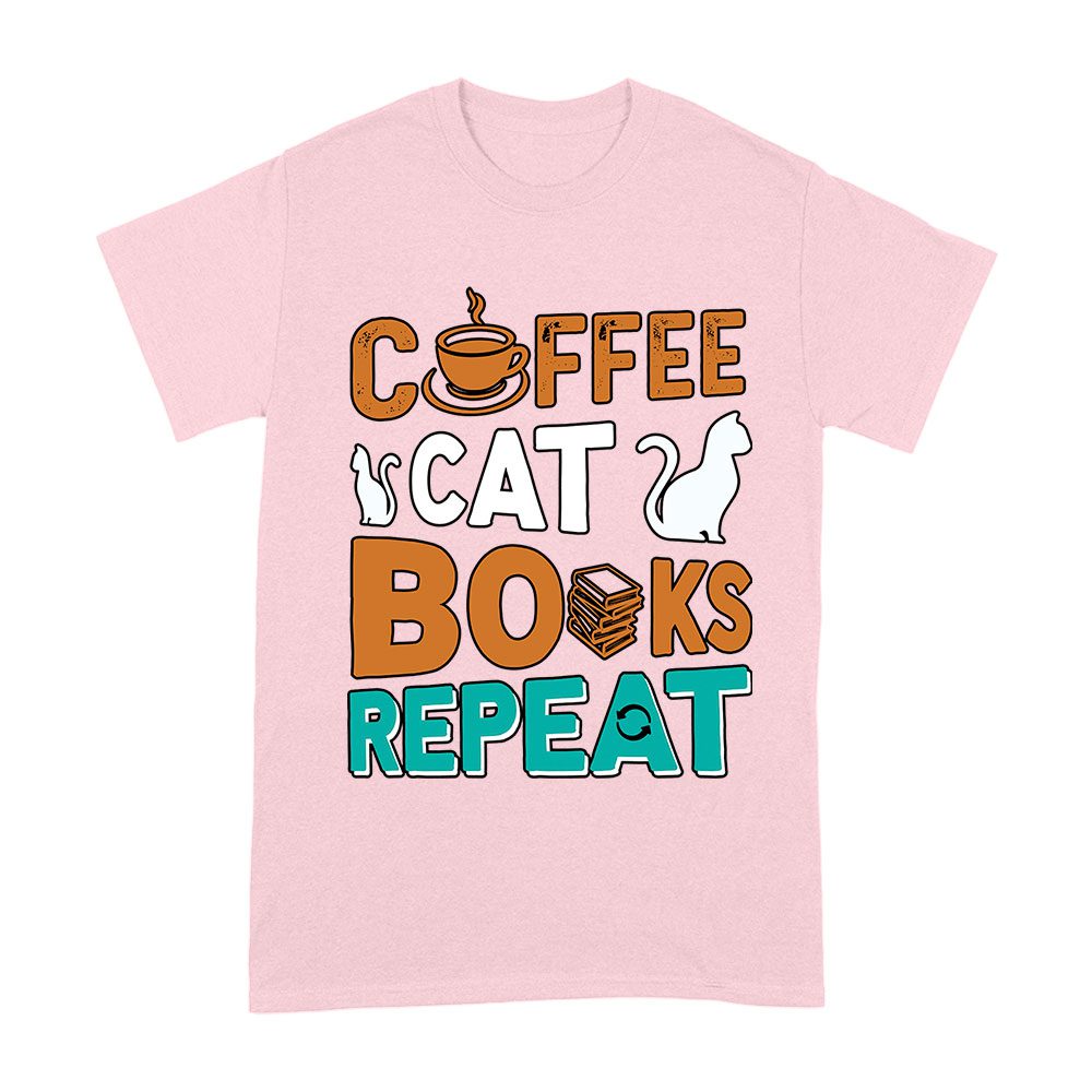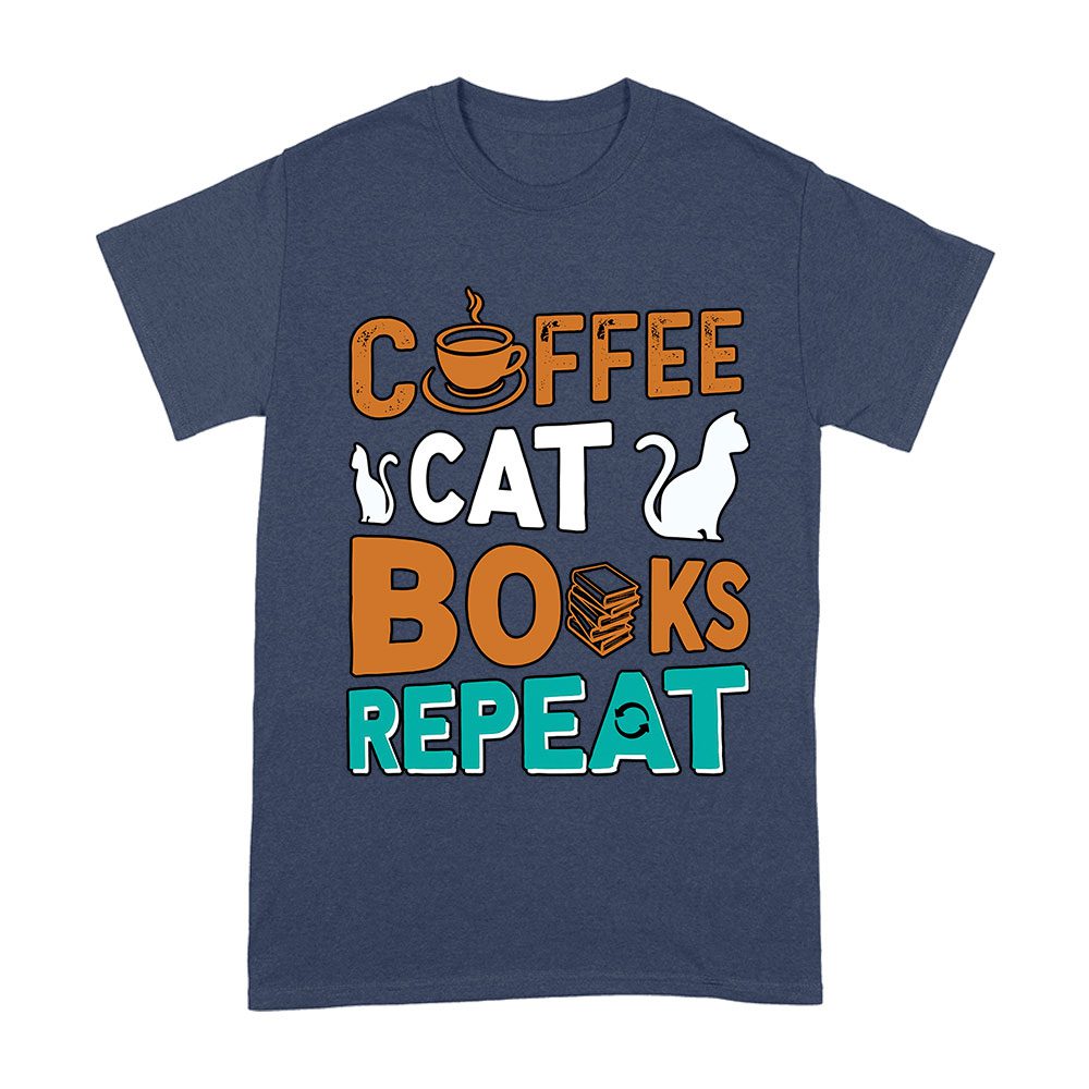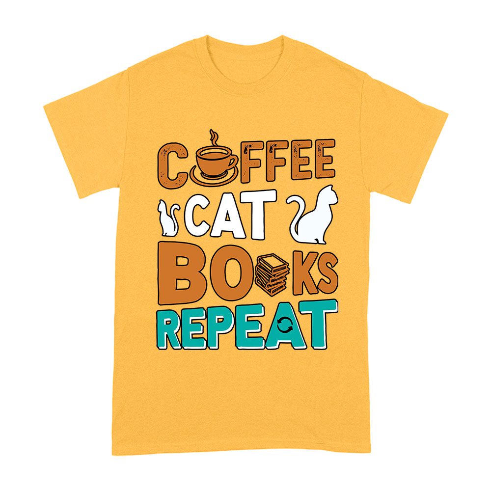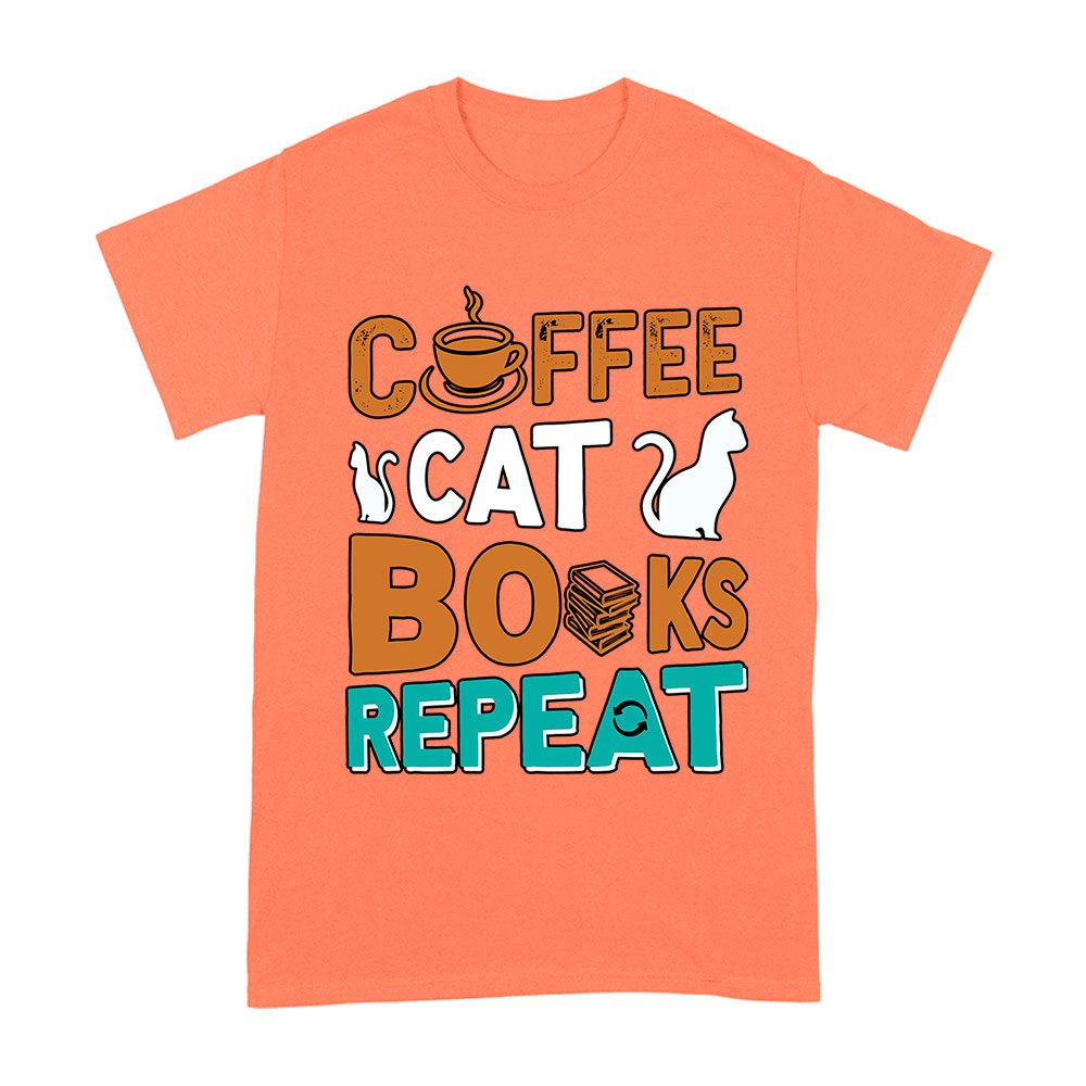 Coffee Cat Books Repeat T-Shirt – Cozy Book Lover Tee for Readers, Cat Owners, Caffeine Addicts, Literary Fans, and Relaxation Enthusiasts