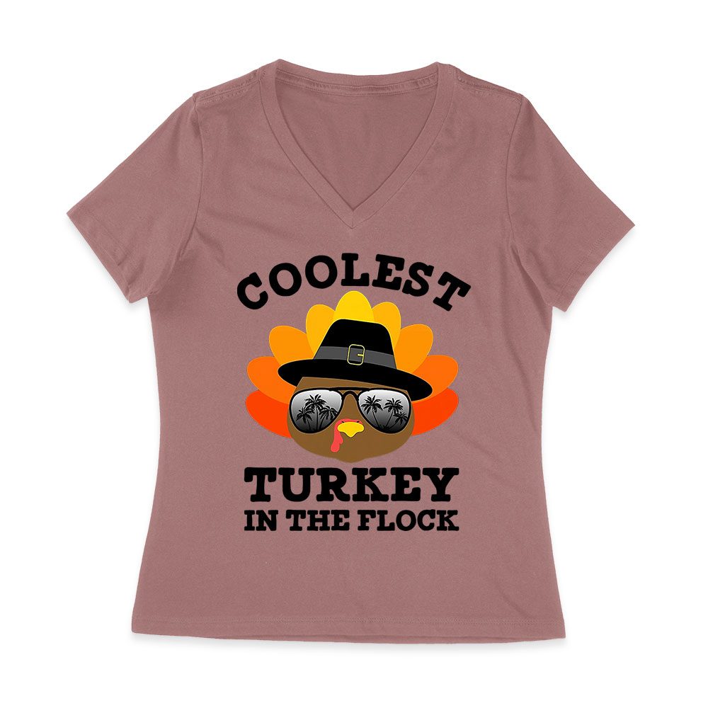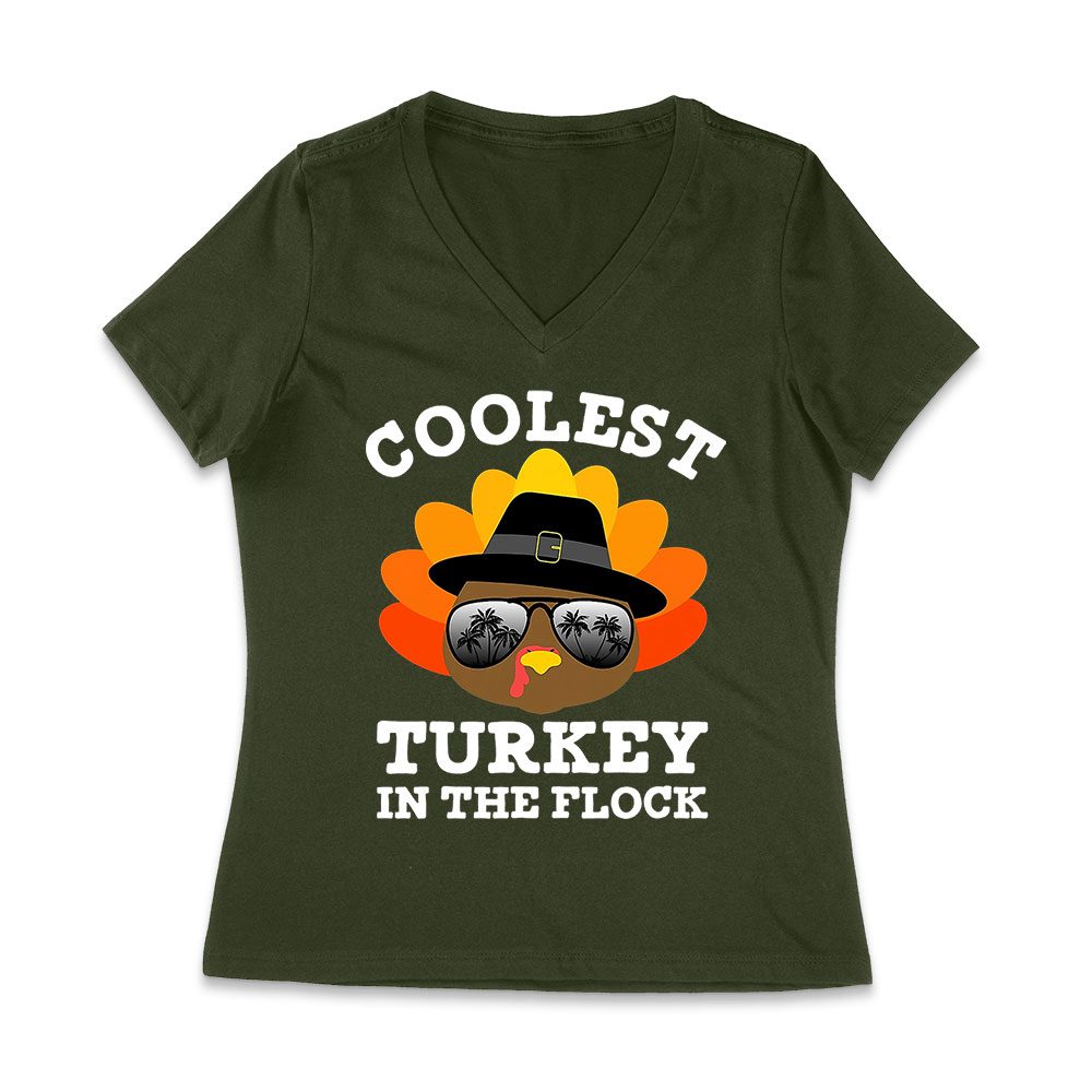 Coolest Turkey in the Flock Thanksgiving T-Shirt – Fun Holiday Wear – Perfect for Turkey Lovers – Stand Out in Style Women Jersey V-Neck