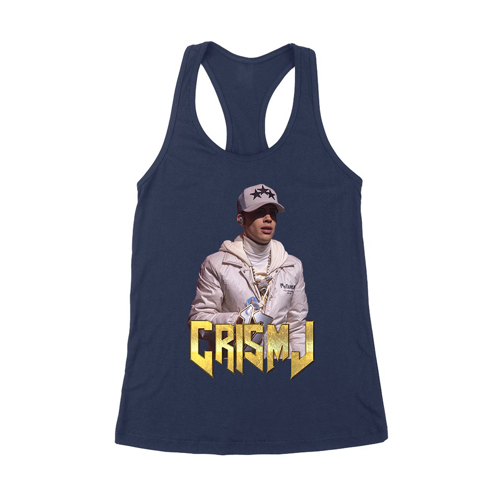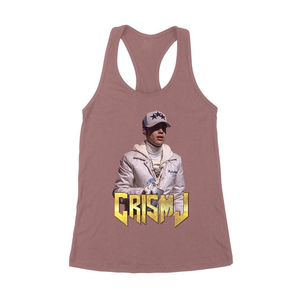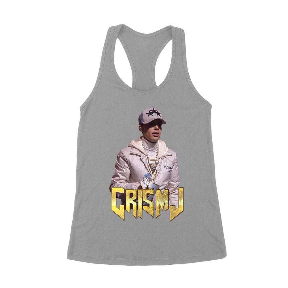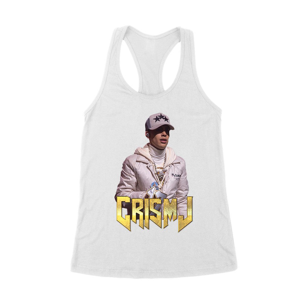 Cris-MJ in White Jacket with Bold Gold Logo Women’s Racerback Tank Top