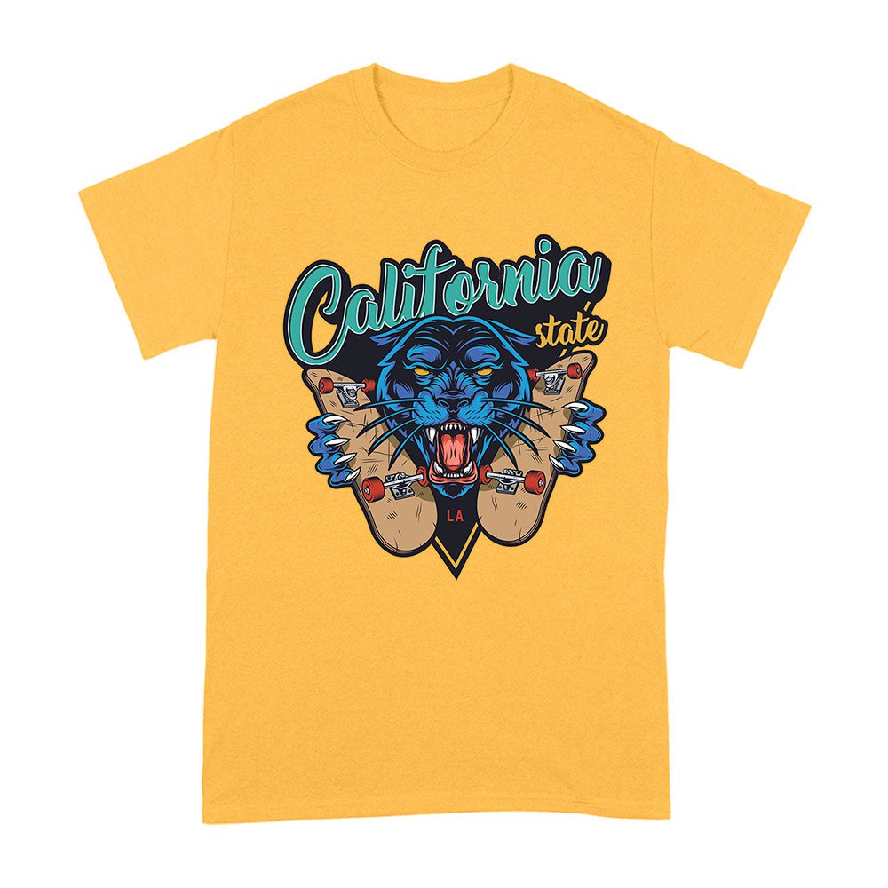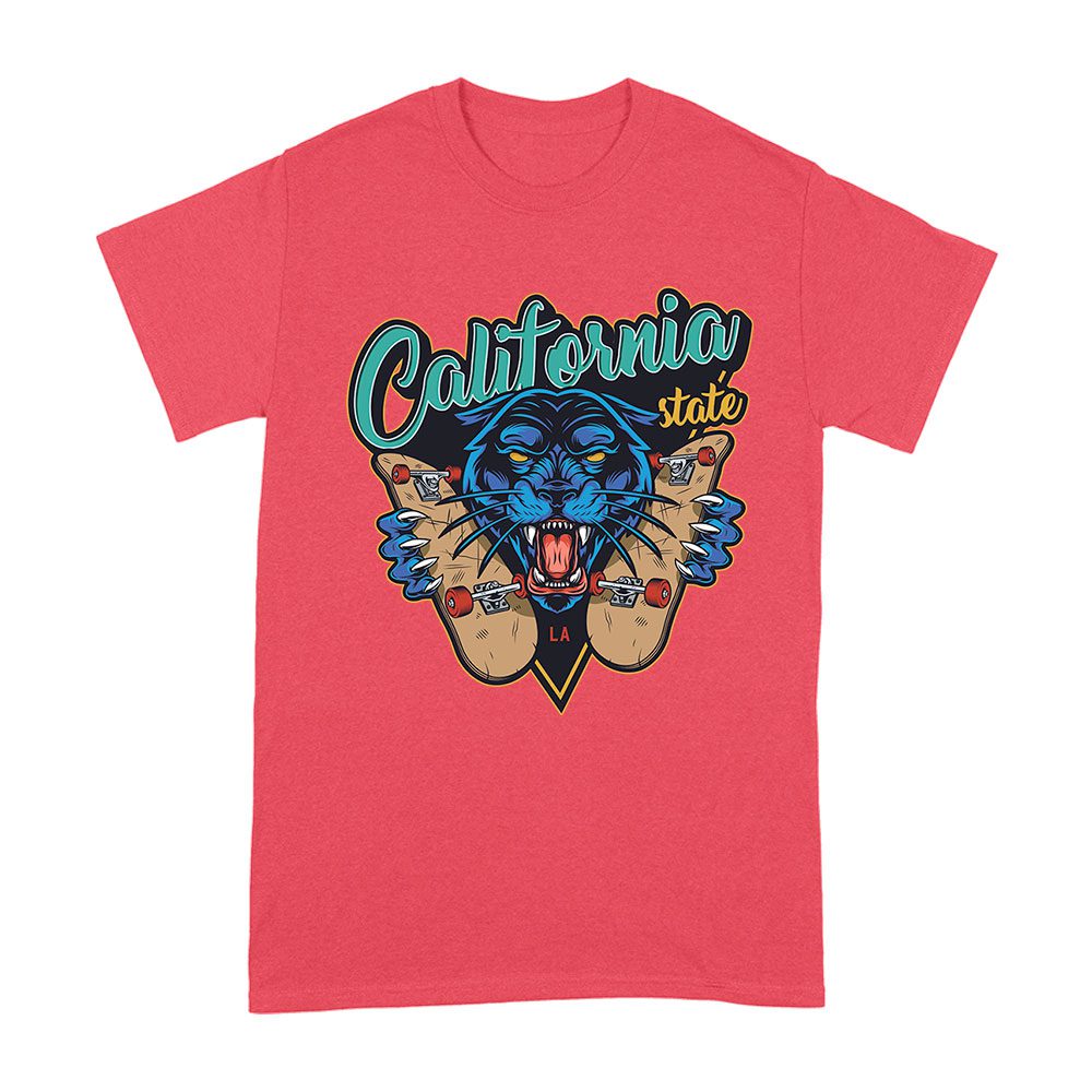 California tiger, skateboarding design, tiger graphic tee, vibrant skate shirt, urban skate style, tiger board art, LA skate fashion, bold tiger print, skateboarding gift, tiger style shirt, streetwear skate tee, fierce tiger design: