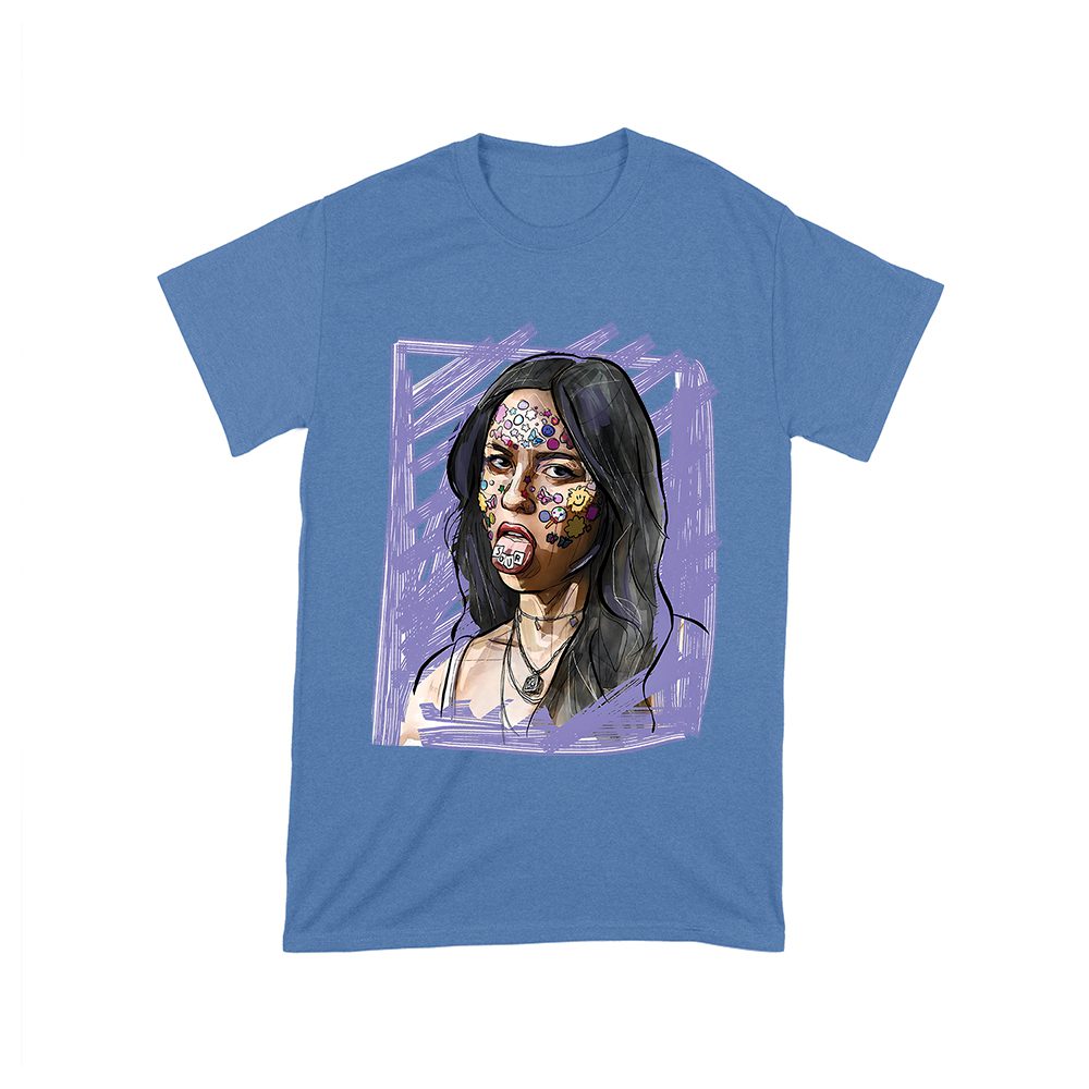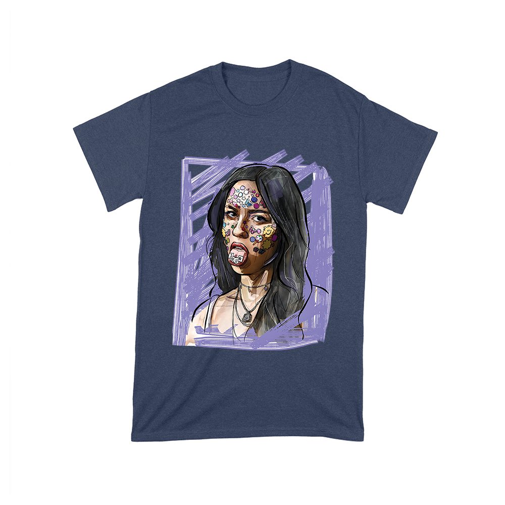 Olivia Rodrigo sketch tee; edgy pop art style shirt; face sticker design top; moody music fan T-shirt; artistic teenage icon tee; emotional music merch: