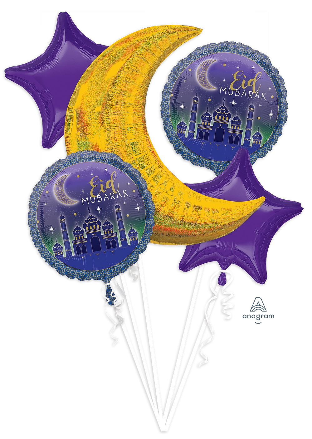 Light up your Eid celebration with a crescent?moon themed foil balloon bouquet (5 balloons). Festive colors for family gatherings and decor.