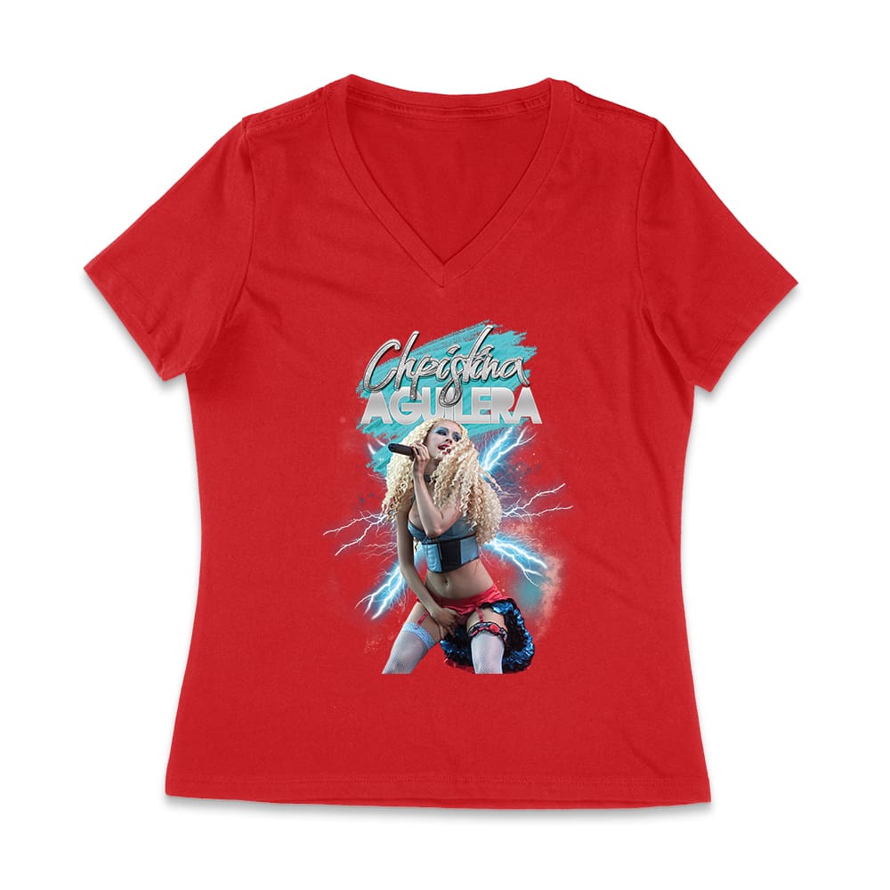 Electric Style Christina Aguilera T-Shirt with Lightning Background and Bold Pose Women Jersey V-Neck