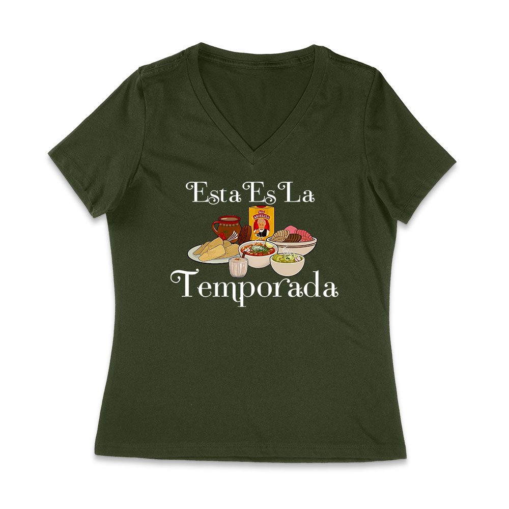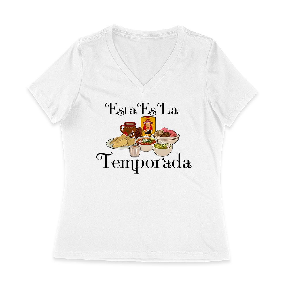 Esta Es La Temporada Foods on the Table Thanksgiving T-Shirt – Fun Holiday Wear – Perfect Gift for Food Lovers – Comfortable Fit Women Jersey V-Neck