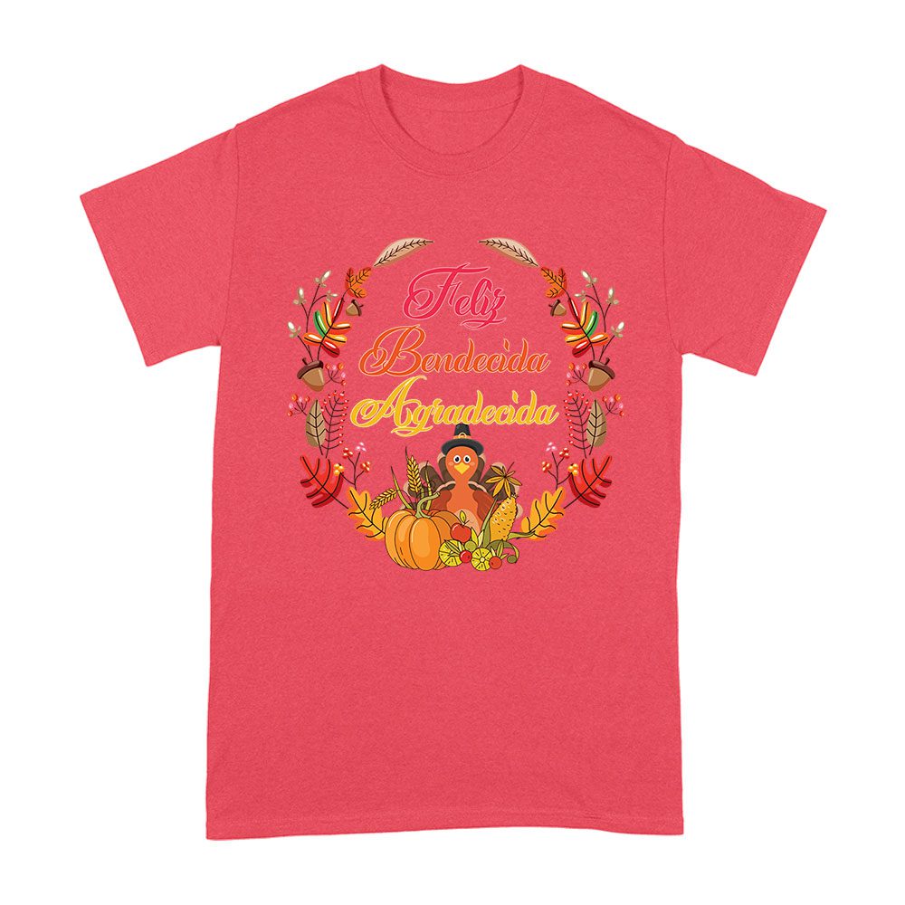 feliz bendecida agradecida, Thanksgiving shirt, holiday wear, cozy fit, fall fashion, festive t-shirt, Spanish blessings, seasonal apparel, unique holiday shirt, autumn vibes, family gathering, grateful apparel, harvest style: