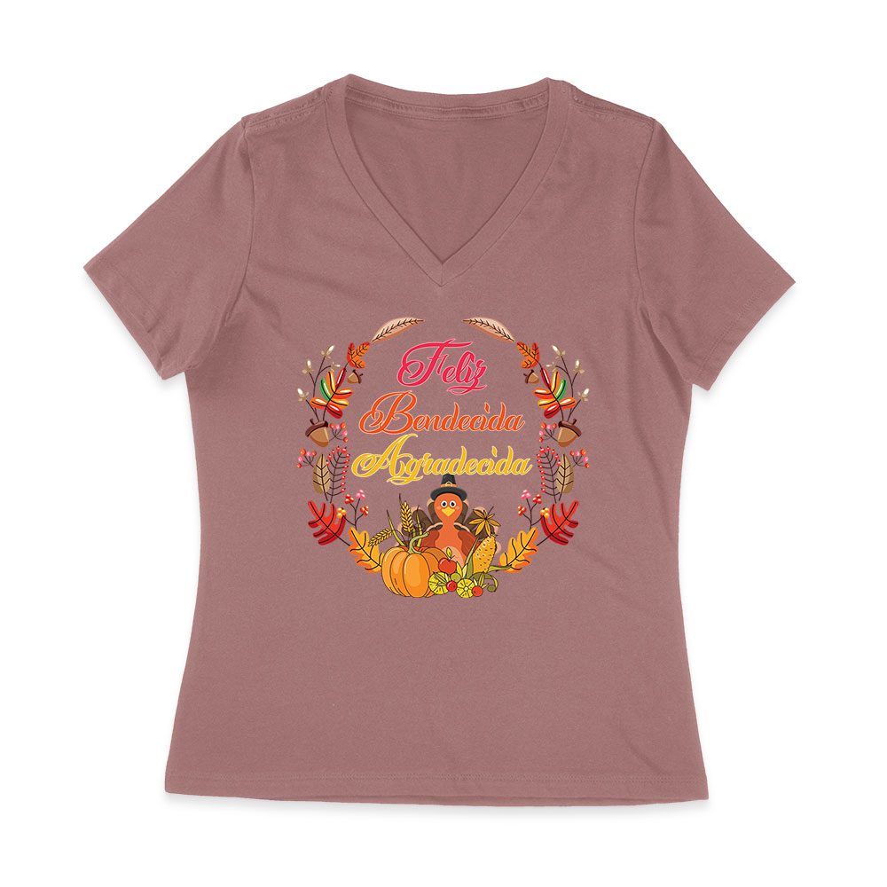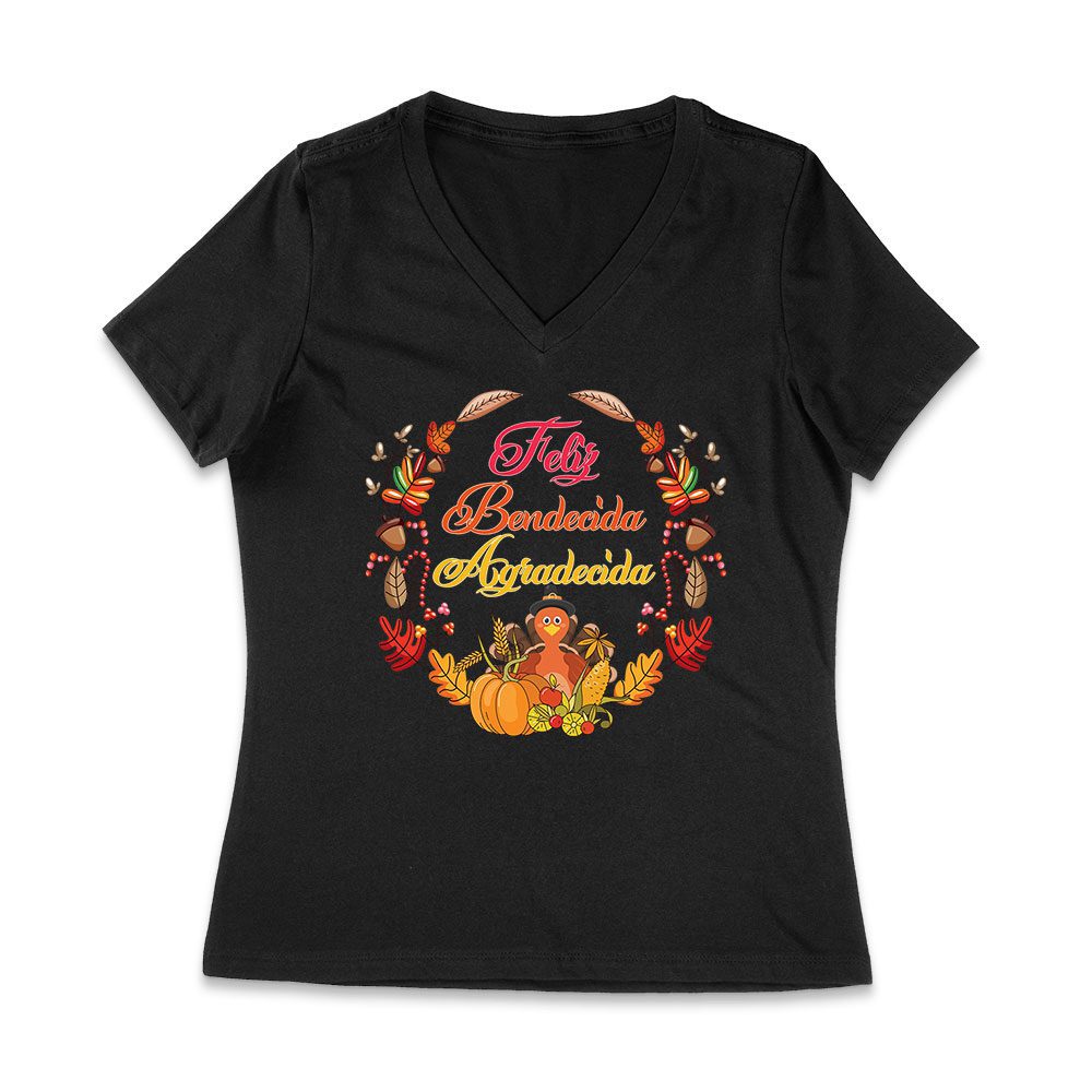 Feliz Bendecida Agradecida T-Shirt – Perfect for Thanksgiving – Celebrate in Style – Cozy and Comfortable Fit Women Jersey V-Neck