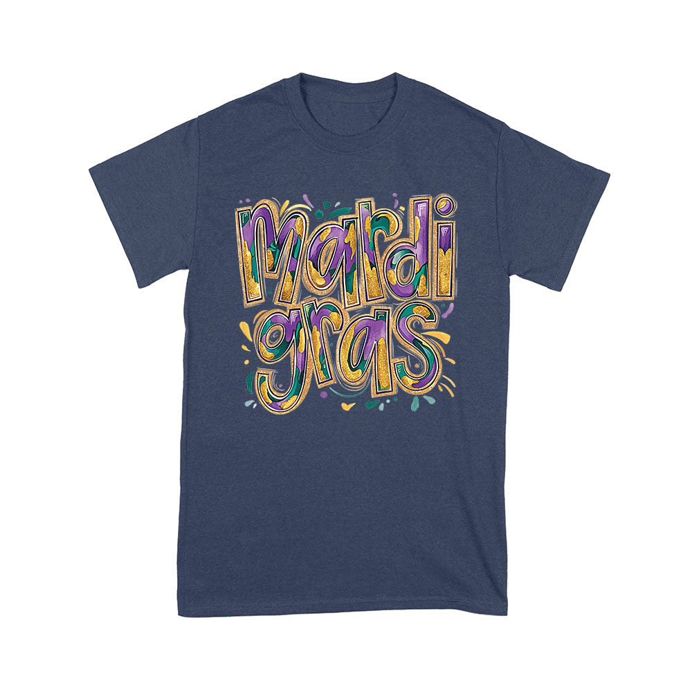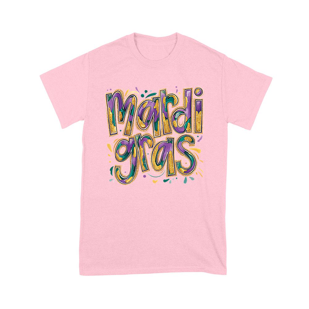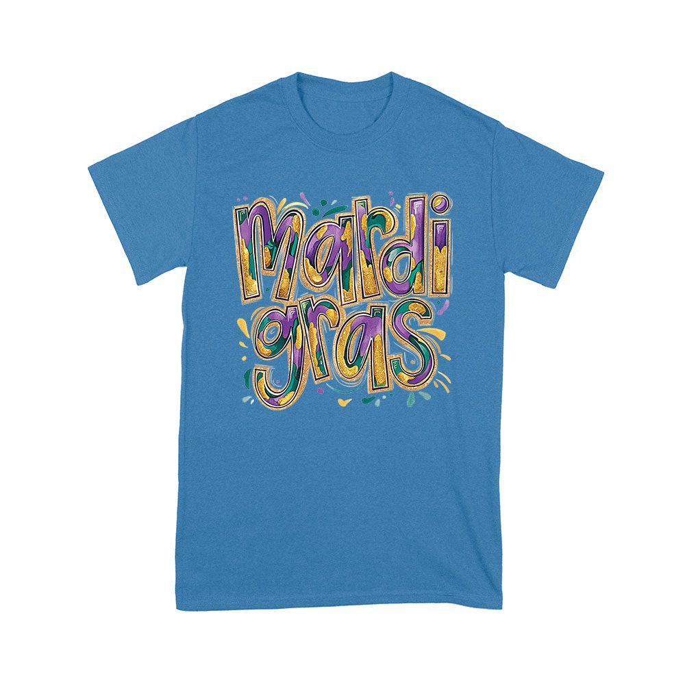 Festive Mardi Gras T-Shirt – Colorful Glitter-Inspired Lettering, Bold Carnival Spirit, Fun New Orleans Party Outfit
