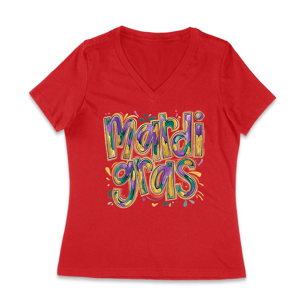 Festive Mardi Gras T-Shirt – Colorful Glitter-Inspired Lettering, Bold Carnival Spirit, Fun New Orleans Party Outfit Women Jersey V-Neck