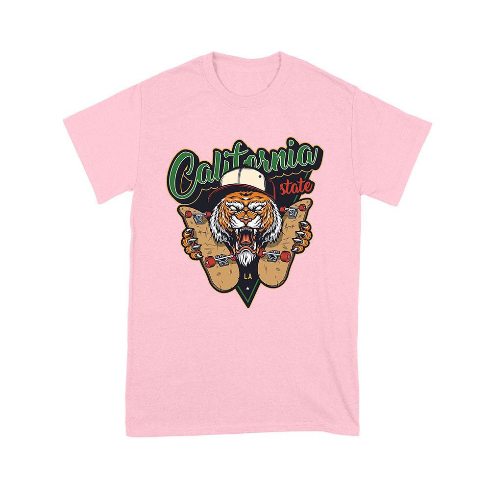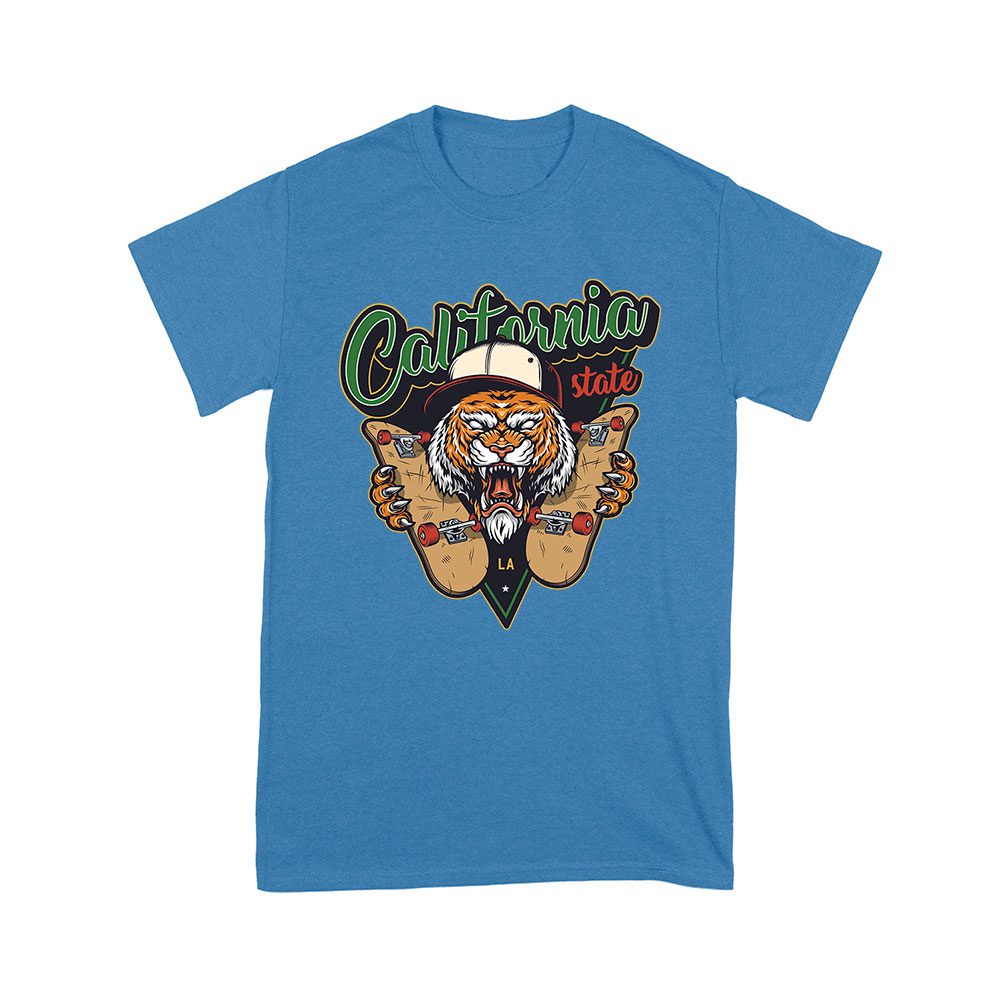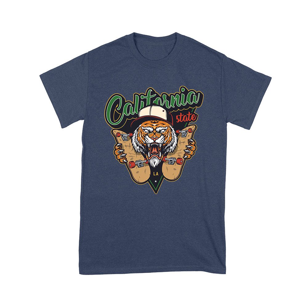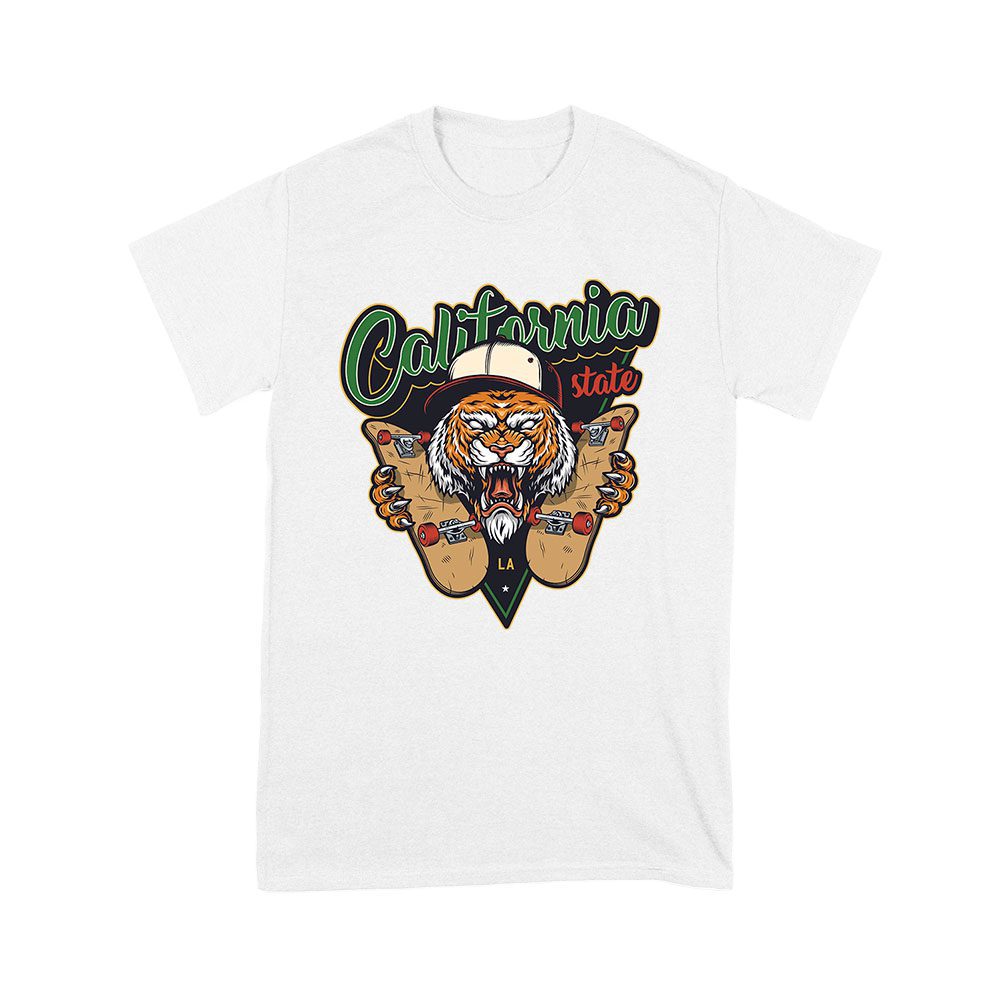 California tiger, skateboarding design, tiger skate shirt, bold graphic tee, skate fan apparel, fierce tiger art, LA skate style, tiger skateboard print, graphic tiger tee, skateboarding gift, tiger design shirt, urban skate style: