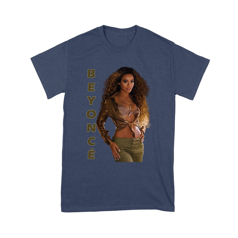 Beyonce glam gold shirt; vertical text pop diva tee; stylish brown outfit design; confident stage queen shirt; classic pop culture tee; music star fanwear — perfect for birthdays, parties, and celebrations.