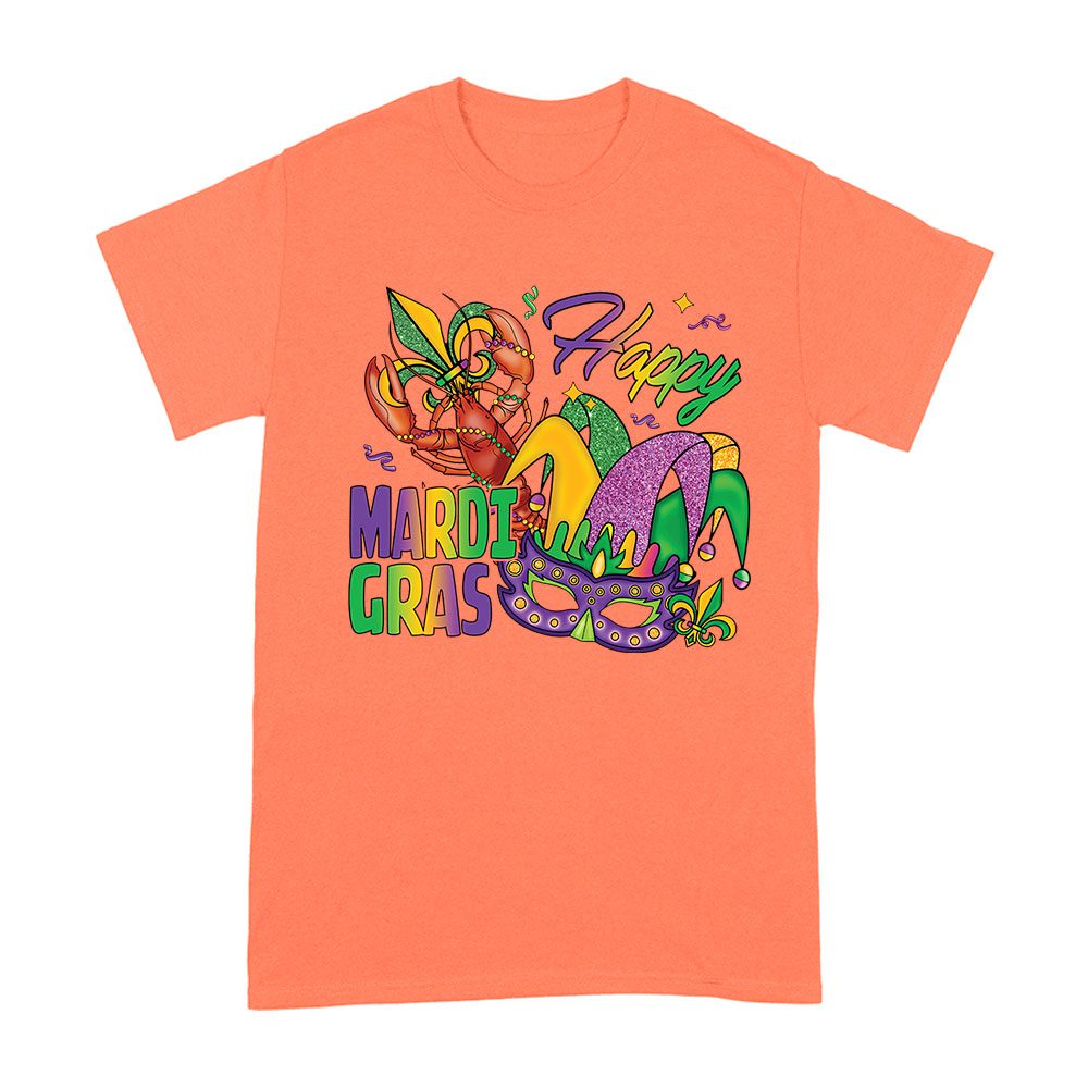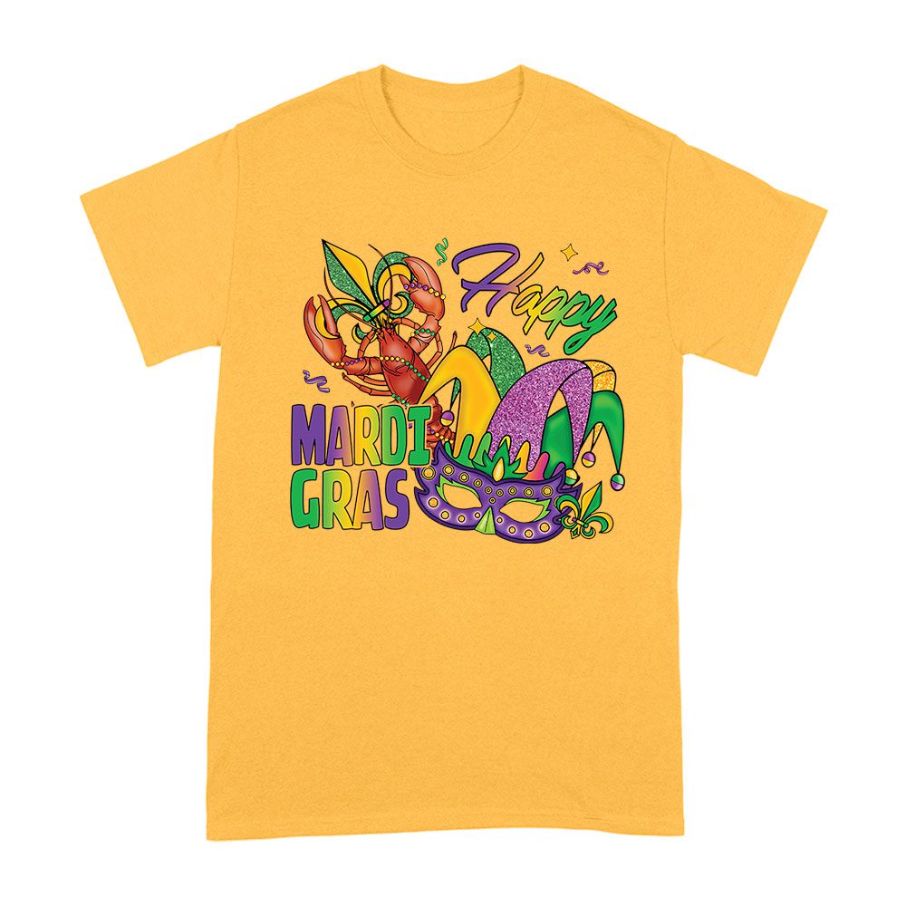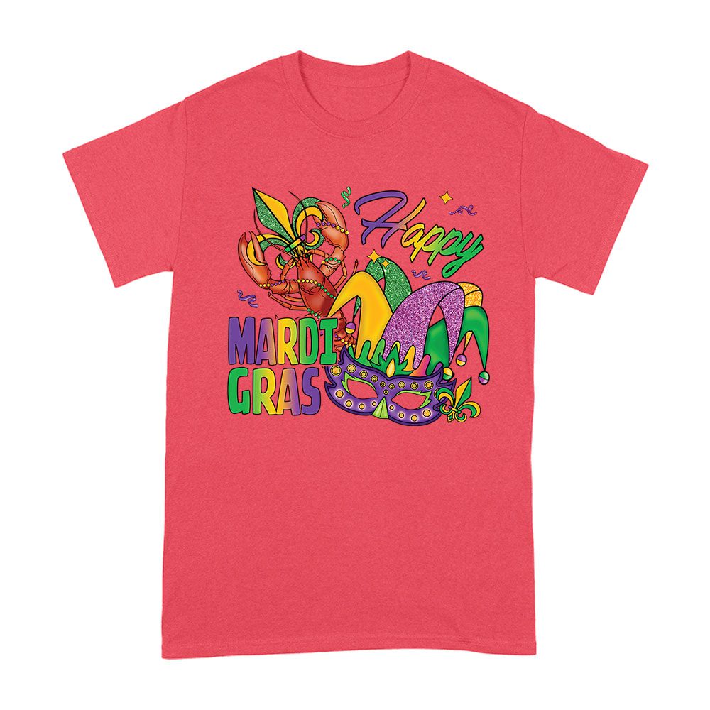 Happy Mardi Gras T-Shirt – Vibrant Carnival Design with Lobster, Jester Hat, Mask, and Festive Beads for New Orleans Party Fun