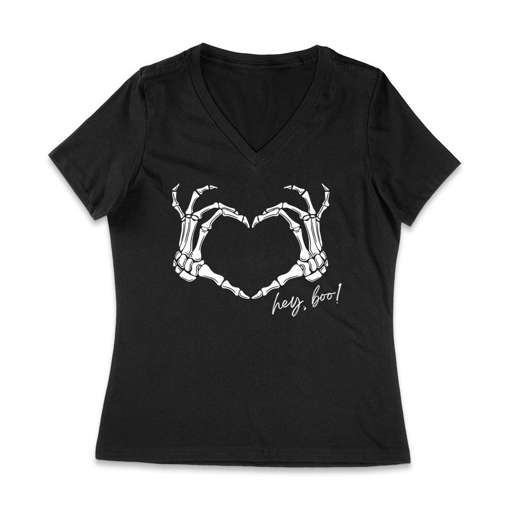 Hey Boo Skeleton Hands Halloween T-Shirt – Cute & Spooky Ghost Costume Tee Women Jersey V-Neck