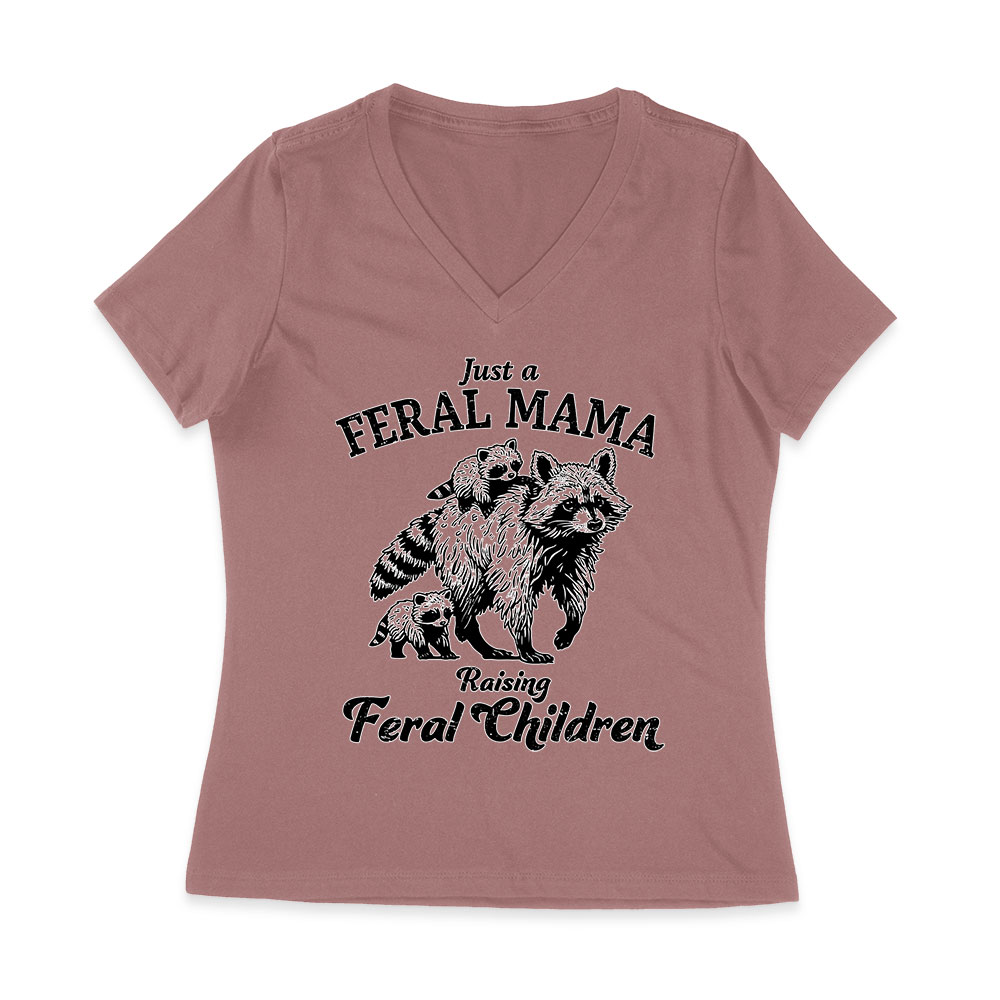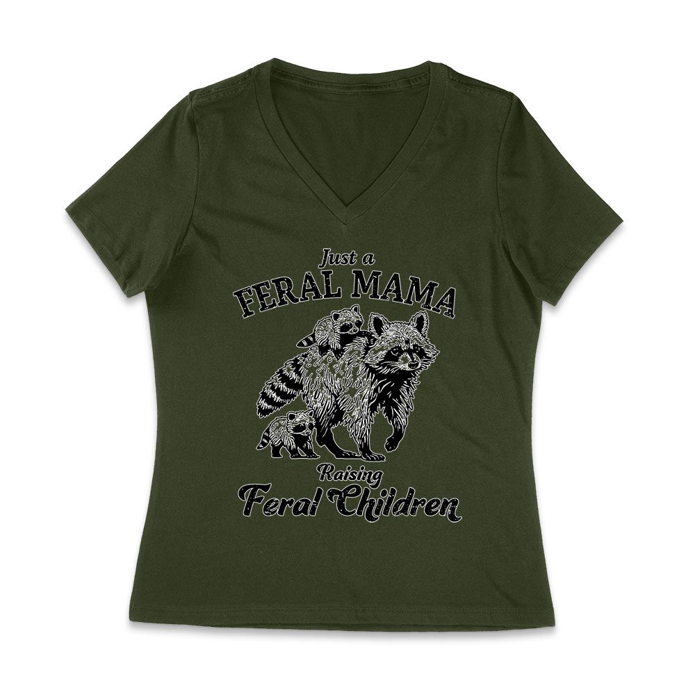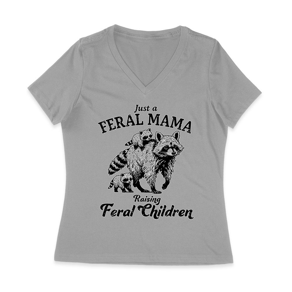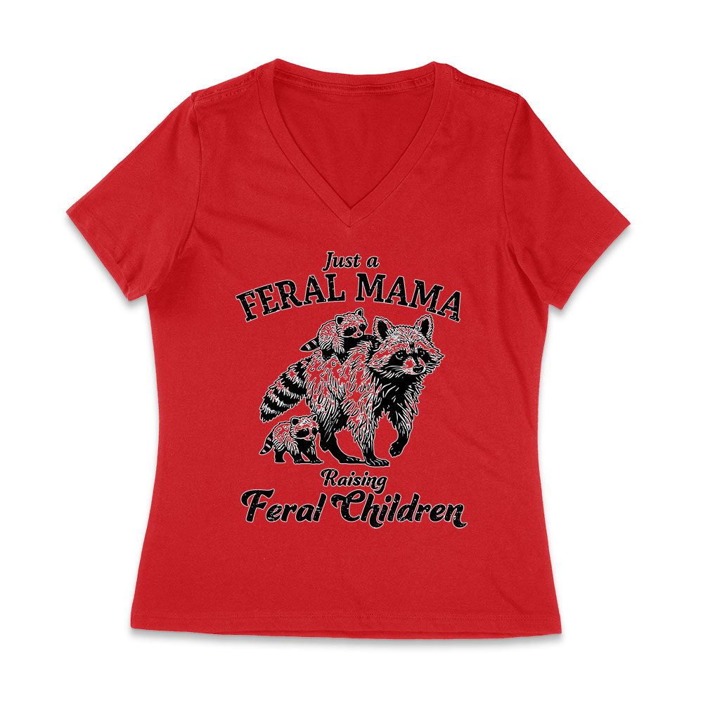 Just a Feral Mama Raising Feral Children – Funny Mom T-Shirt – Wild Motherhood Humor Tee Women Jersey V-Neck