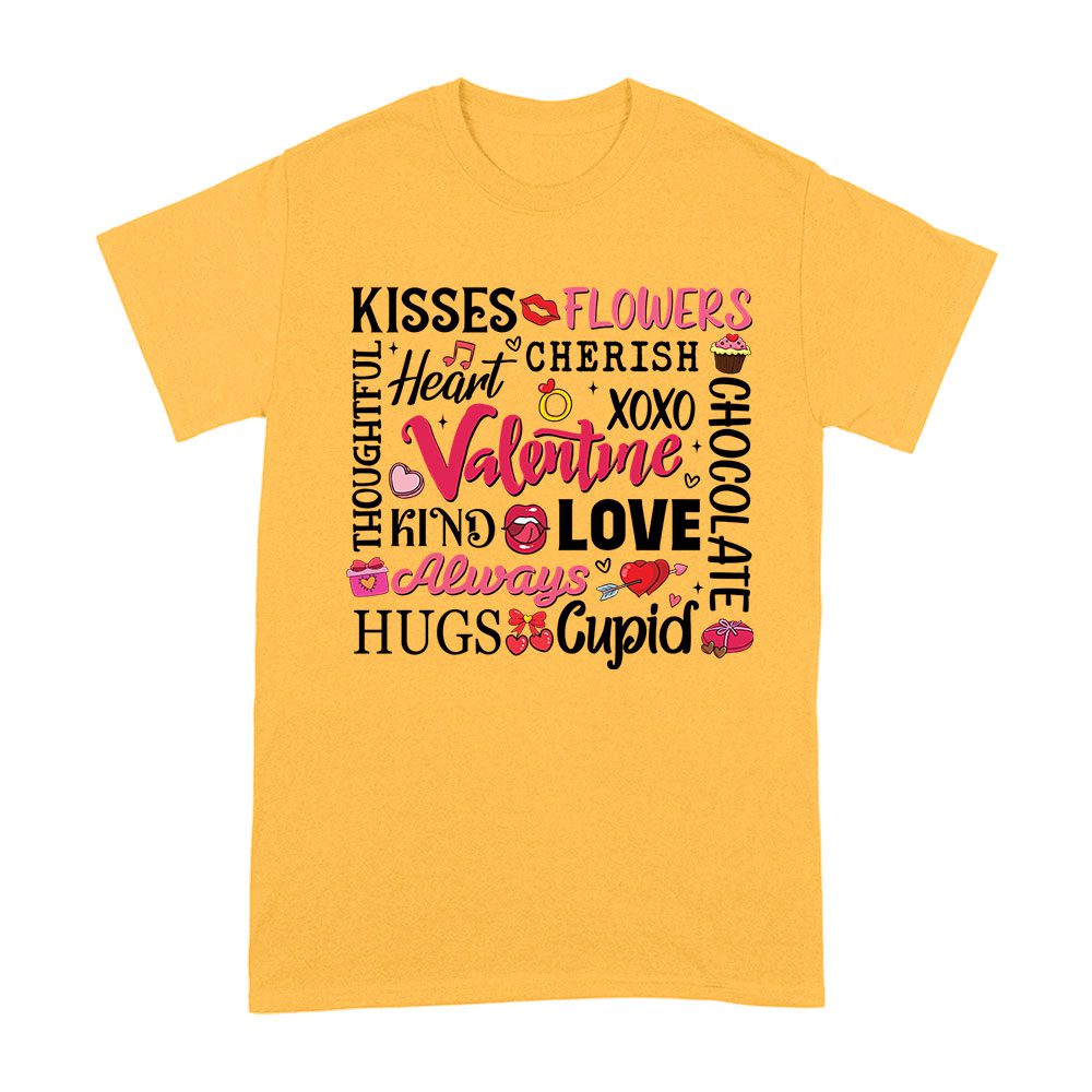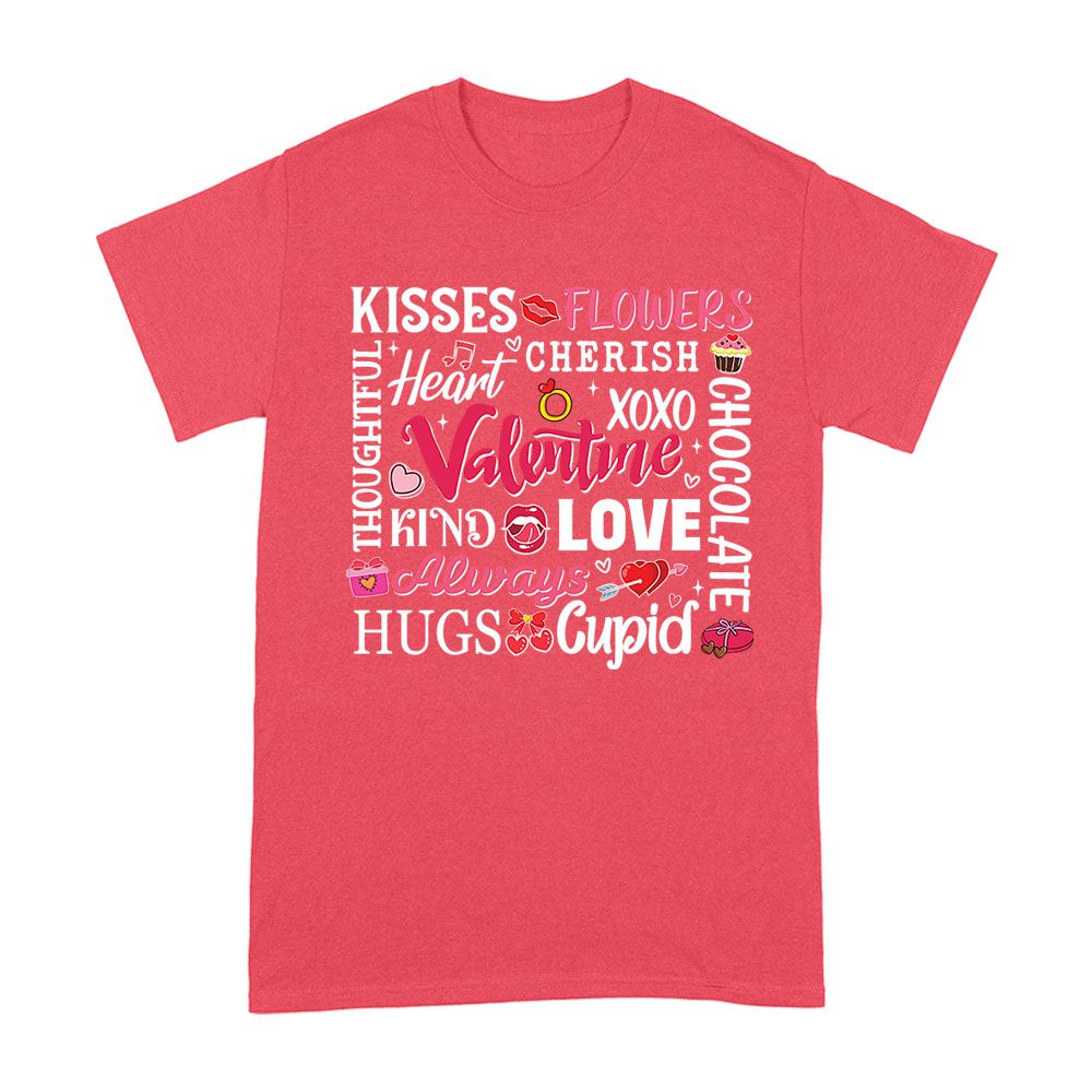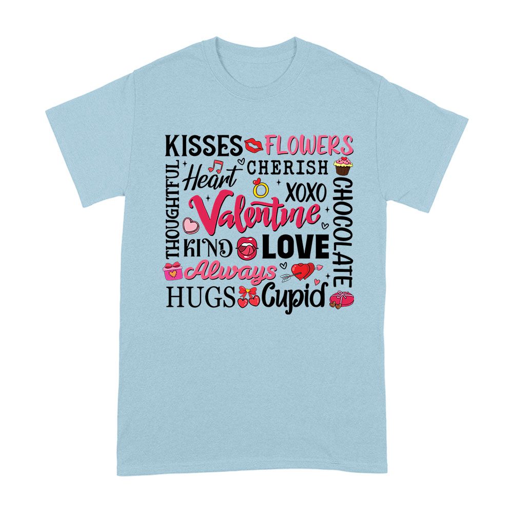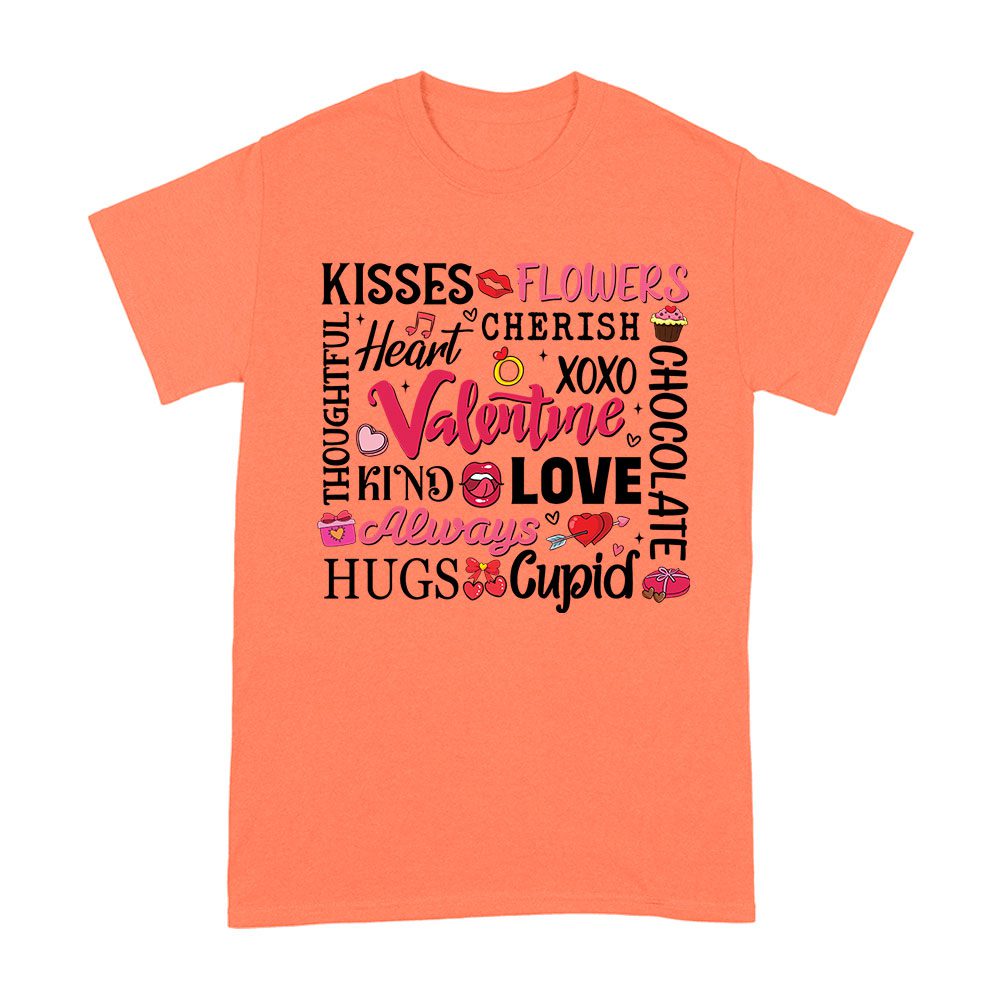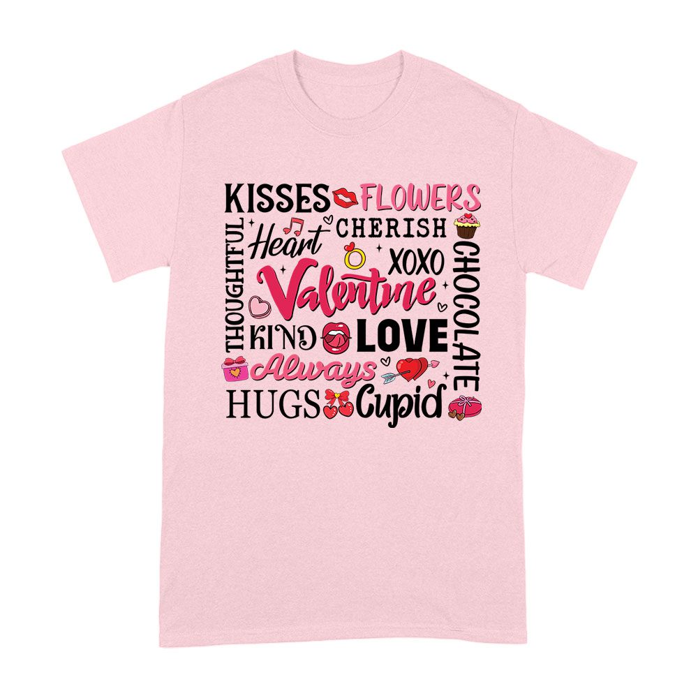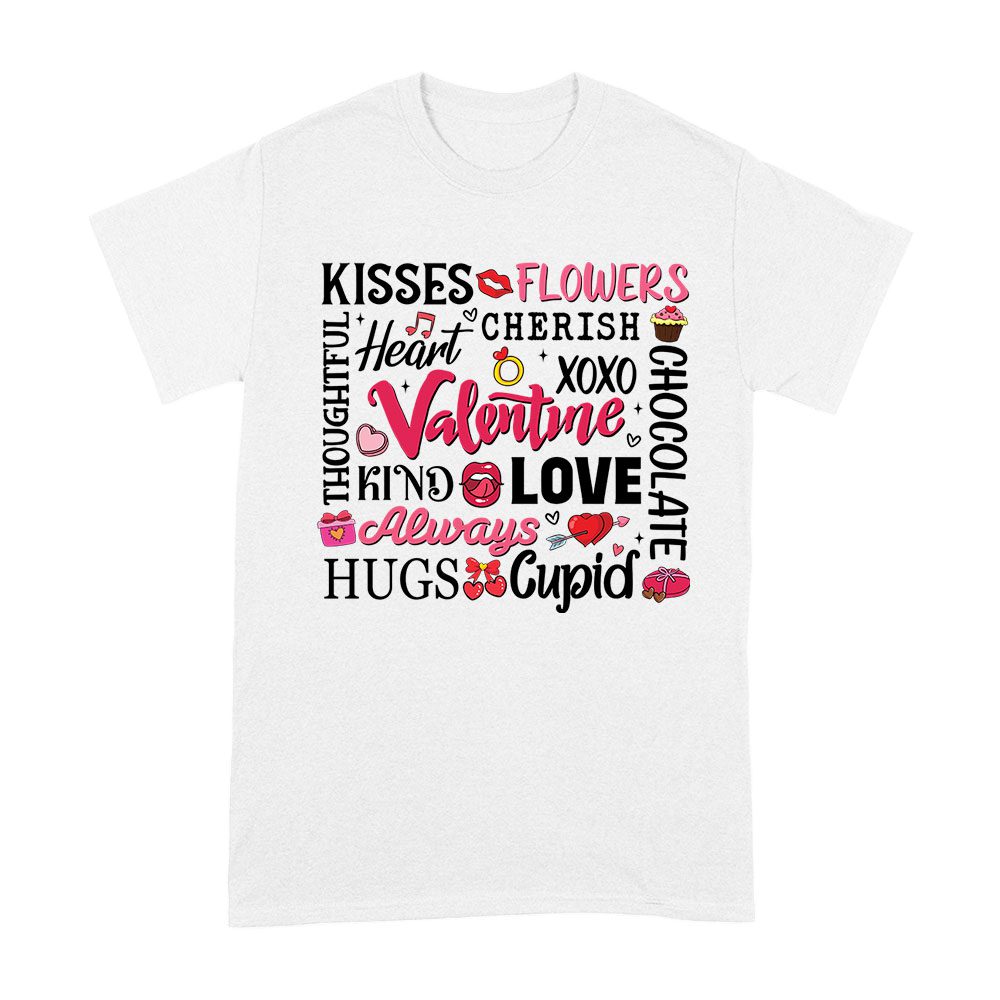 Kisses, Flowers, and Cherish T-Shirt – Thoughtful Valentine’s Day Gift with Heart, XOXO, and Love Design for Couples, Women, and Men