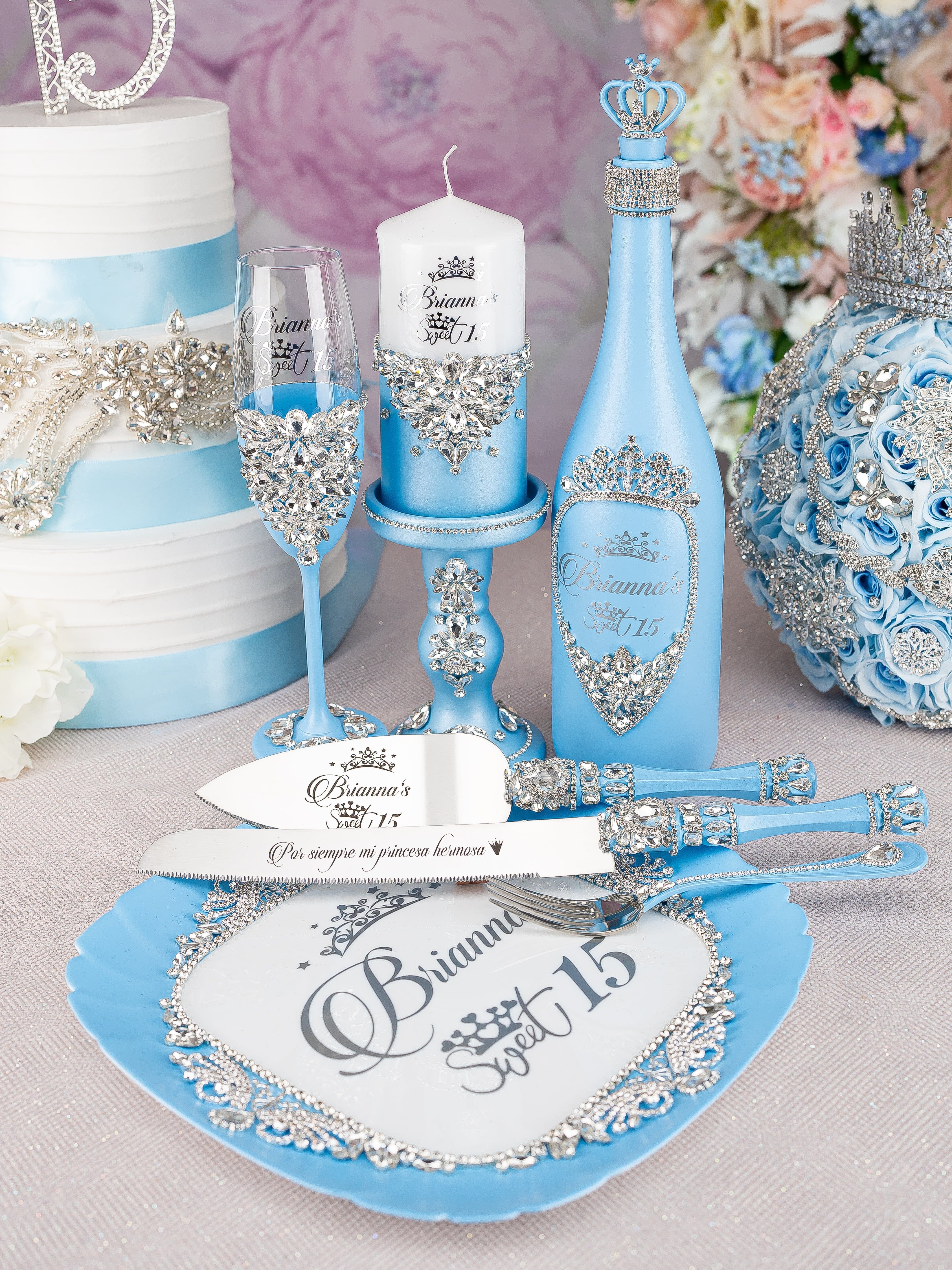 Celebrate your Quincea?era with our exquisite Light Blue Quincea?era Brindis Set with bottle and candle. With intricate detailing, personalized options, and high-quality materials, this set is a cherished symbol of tradition, family, and celebration. Make your quincea?era toast truly special with our beautifully crafted Brindis Set.Brindis package with bottle and candle includes:~ cake server, knife~ plate, 1 fork~ 1 champagne glass~ 1 bottle (empty)~ candle with candle holder All the items are hand-made.Can be personalized with name and date of your celebration.We can decorate this set with any color or text you want.