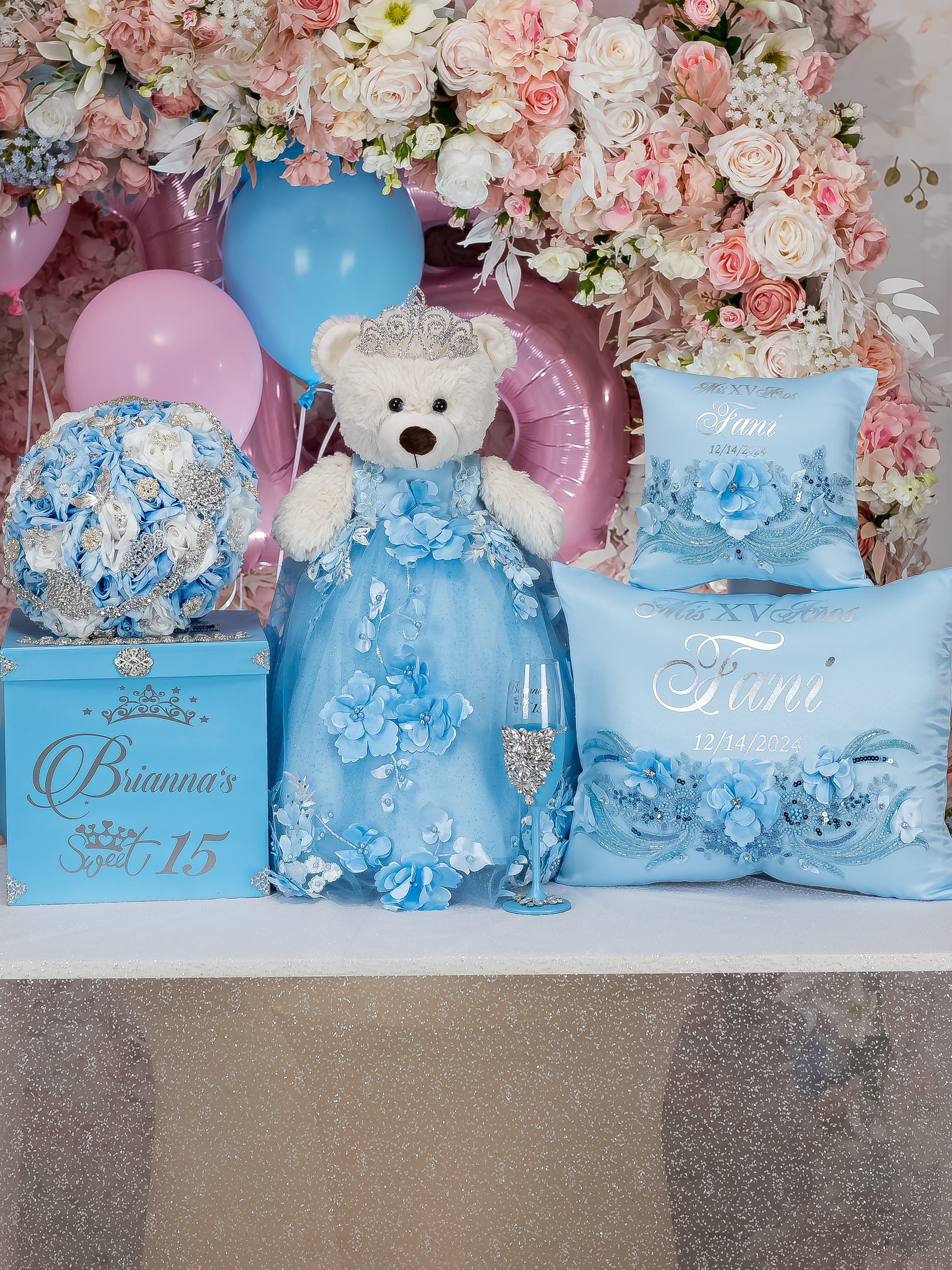Commemorate your Quincea?era with this charming light blue ?ltima Mu?eca teddy bear. Symbolizing the transition from childhood to adulthood, this plush bear is a beloved tradition that represents the last doll gifted to the Quincea?era.?