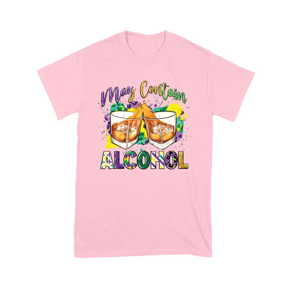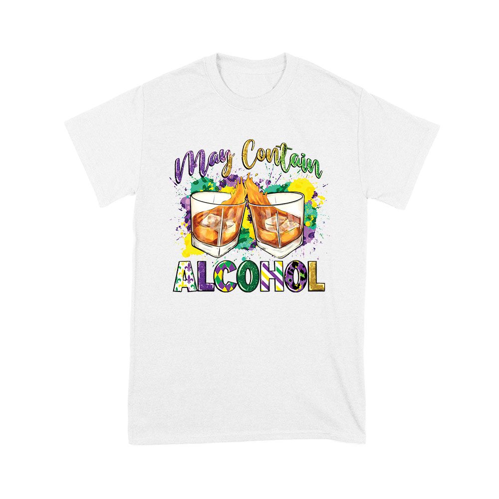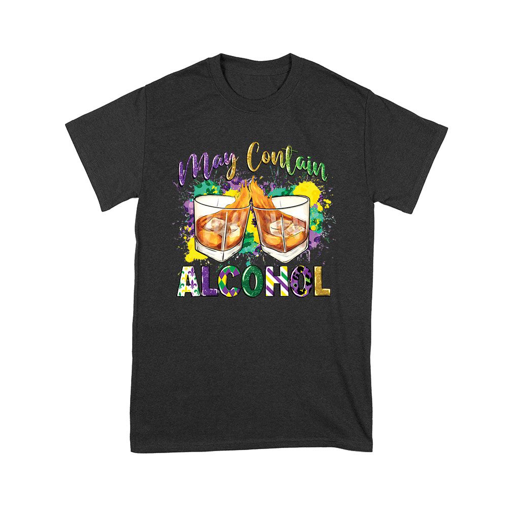 Mardi Gras T-Shirt – Funny “May Contain Alcohol” Design, Whiskey Glasses & Festive Colors, Party Outfit for Fat Tuesday & New Orleans Celebration