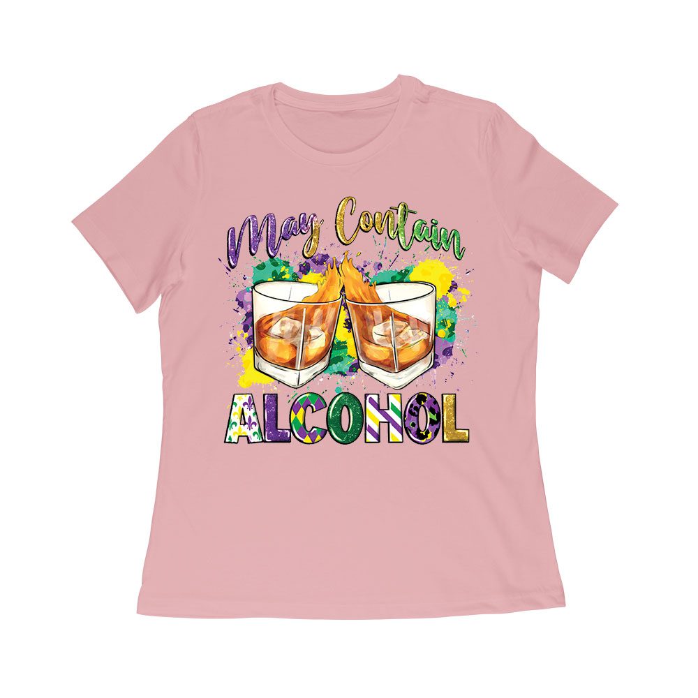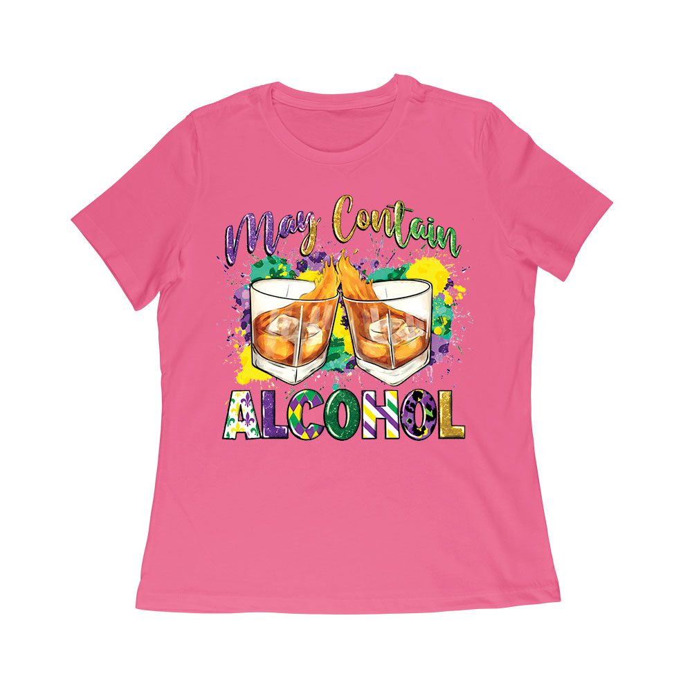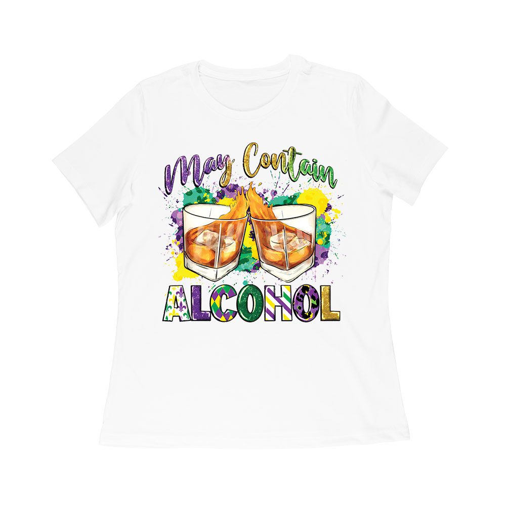Mardi Gras T-Shirt – Funny “May Contain Alcohol” Design, Whiskey Glasses & Festive Colors, Party Outfit for Fat Tuesday & New Orleans Celebration Women Relaxed