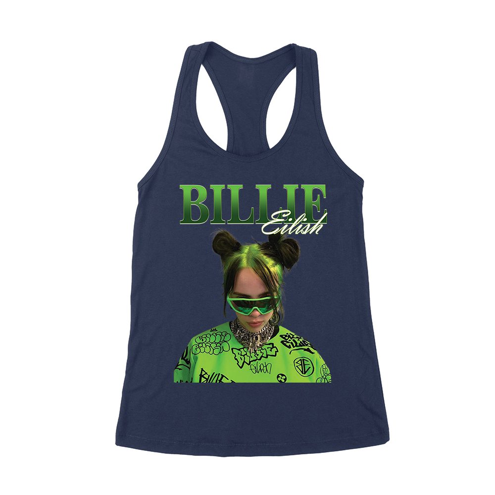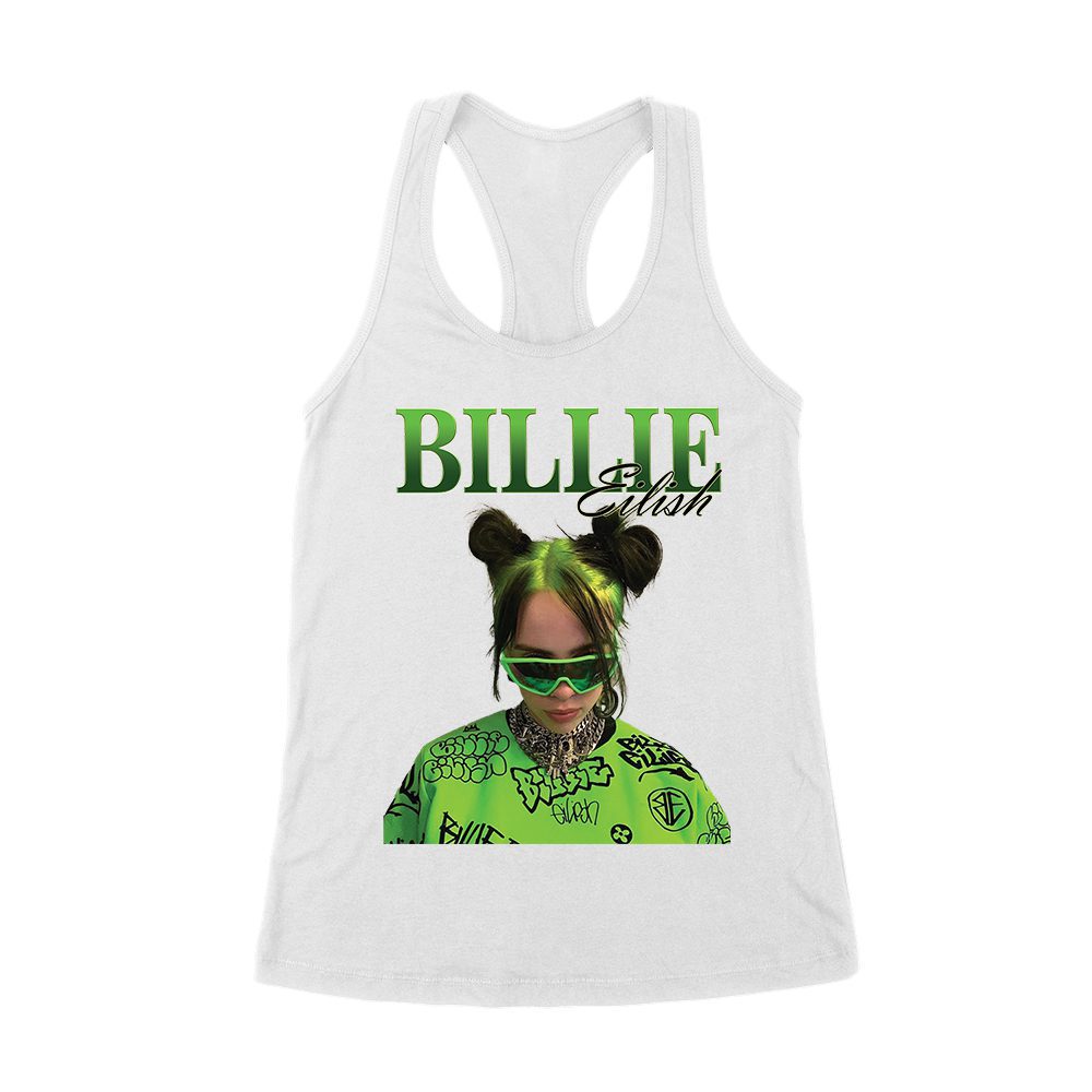 Neon Green Billie Eilish Face Design T-Shirt with Signature Look Women’s Racerback Tank Top