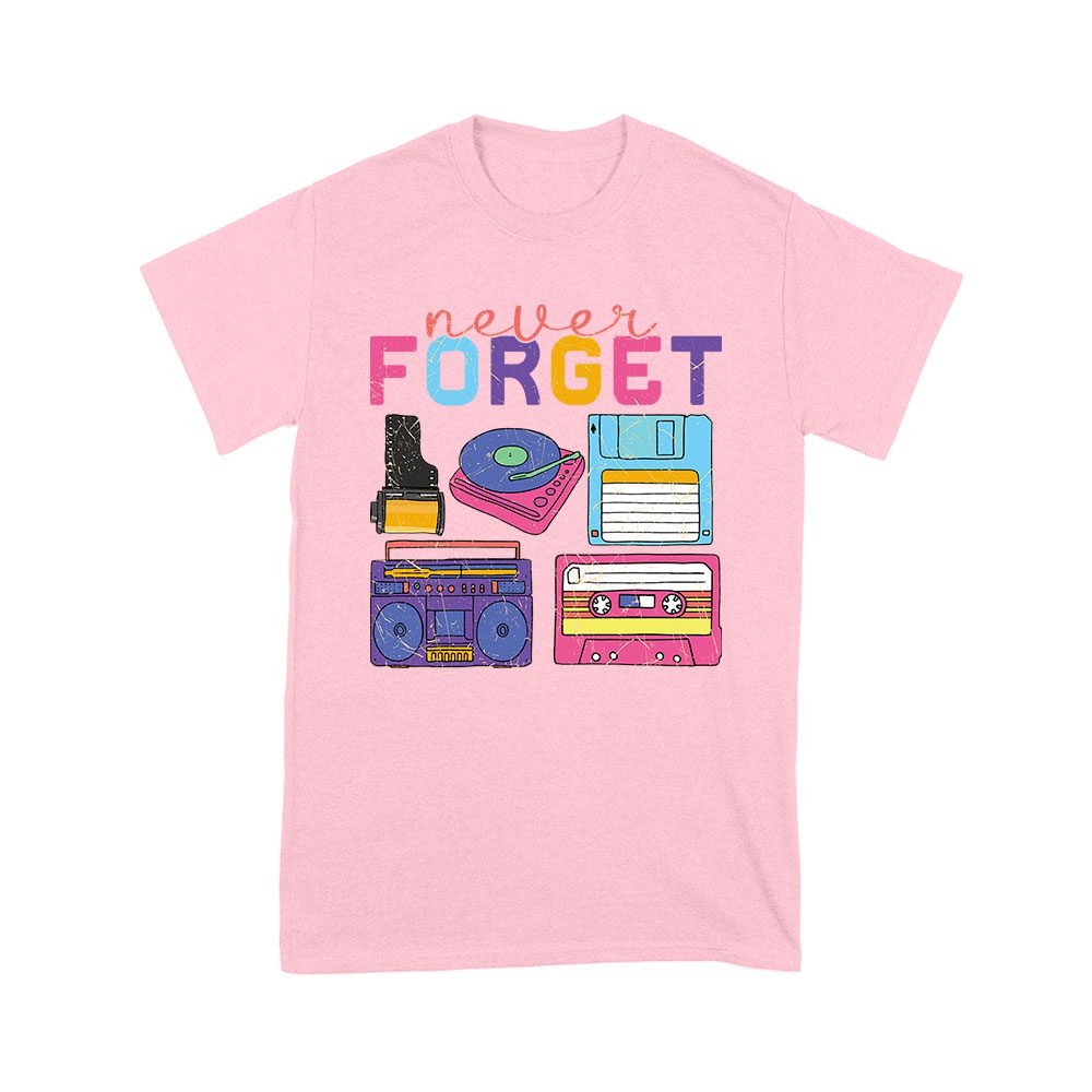 Never Forget – Camera Reel – Gramophone – Floppy Cassette – and Cassette Piece T-Shirt – Retro Nostalgia Tee for Vintage Tech Lovers Unisex Youth