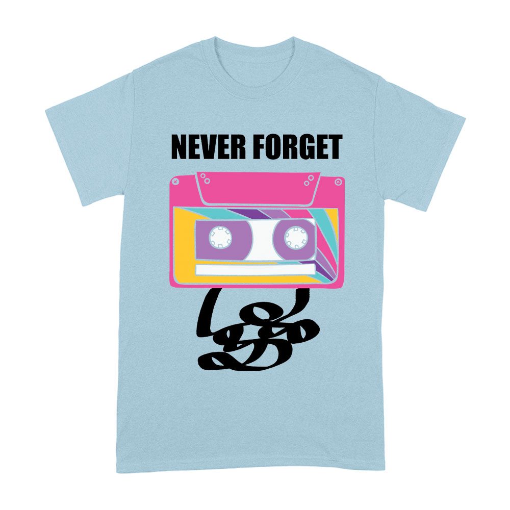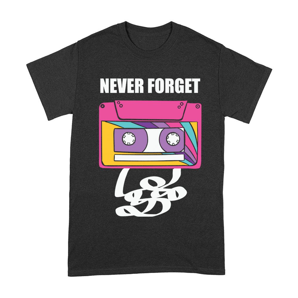 Never forget – cassette, cassette piece – tape, cassette with tape, vintage tech – t-shirt, nostalgic design – classic, throwback – music lovers, retro vibe – old-school, analog media, classic cassette: