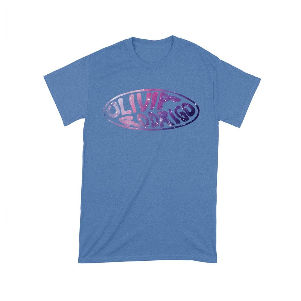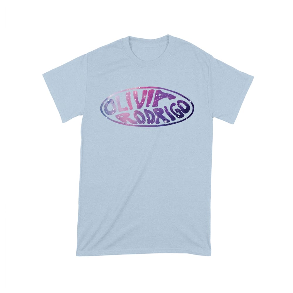 Olivia Rodrigo glitter logo tee; oval name design shirt; retro pop graphic top; music fan bubble style tee; pastel purple print shirt; teenage artist merch — perfect for birthdays, parties, and celebrations.