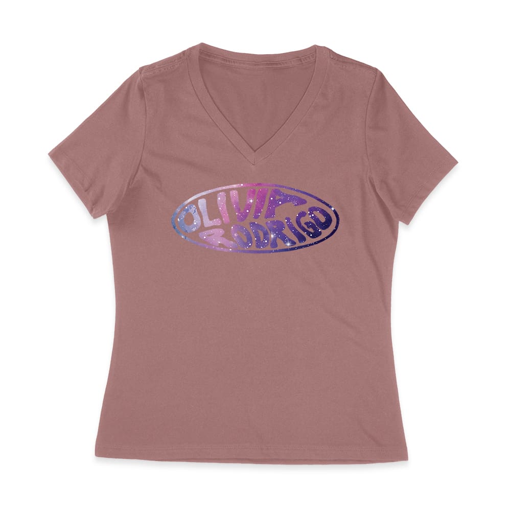 Olivia Rodrigo glitter logo tee; oval name design shirt; retro pop graphic top; music fan bubble style tee; pastel purple print shirt; teenage artist merch — perfect for birthdays, parties, and celebrations.