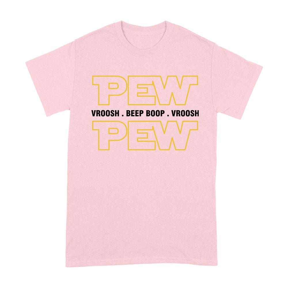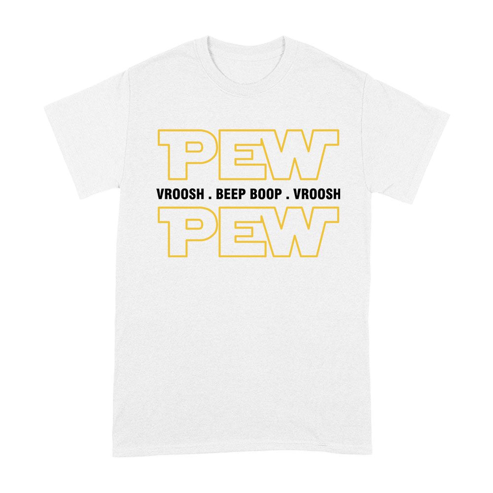 sci-fi sound effects, funny space tee, PEW VROOSH shirt, beep boop design, retro sci-fi tee, galaxy battle shirt, space warrior tee, pop culture humor, movie fan apparel, nerdy graphic tee, robot sound shirt, classic sci-fi quote, geeky fan gift: