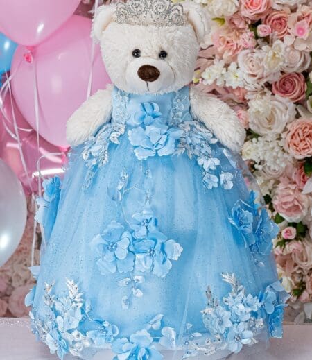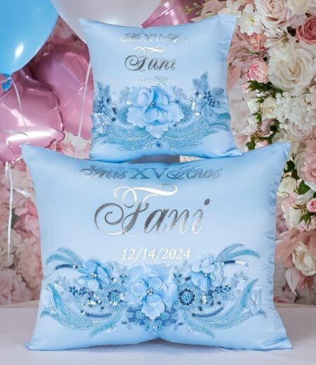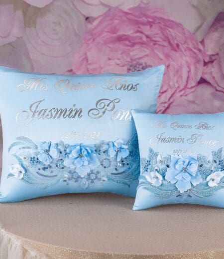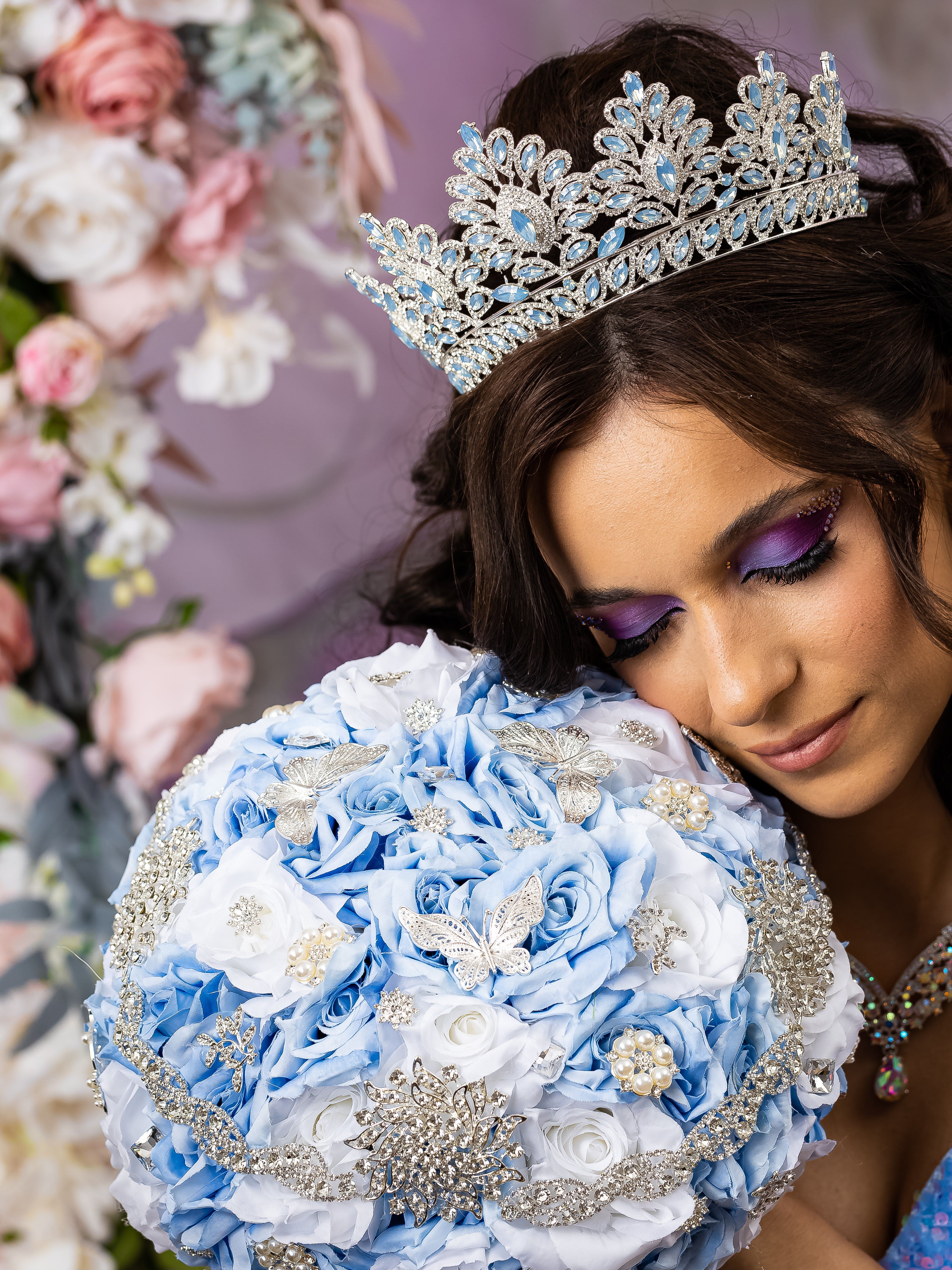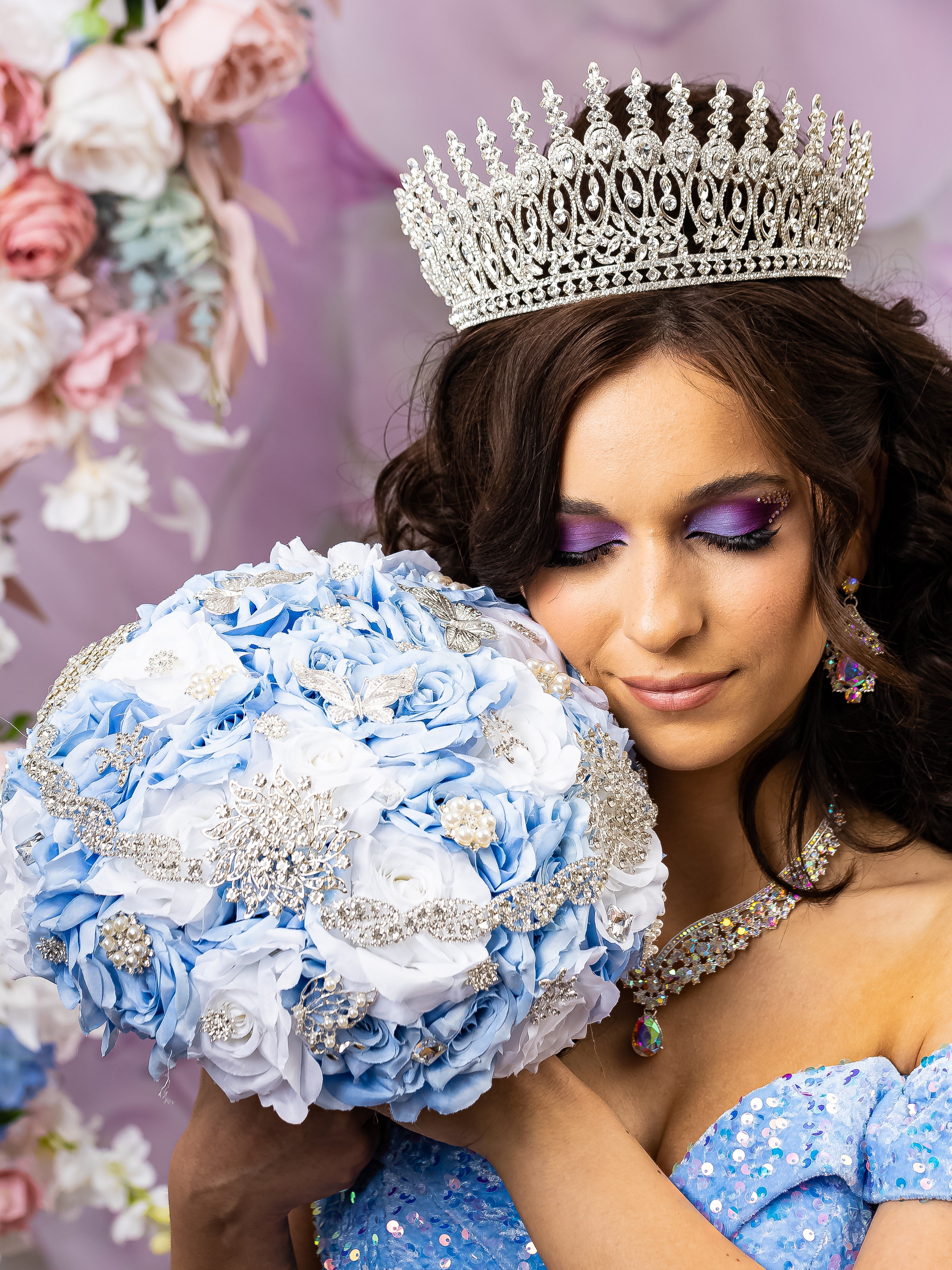 Behold the exquisite Quincea?era brooch bouquet in Light Blue Silver color! This quince bouquet shines with luxury and splendor, made with carefully chosen brooches of different shapes and sizes, crafted by hand.A handle wrapped in gold satin ribbon with attached heart that adds a personalized touch. This brooch bouquet is not only a beautiful accessory but also a cherished keepsake that captures the essence of your Quincea?era party. Bouquet size: 9 inches L x 13 inches HHand-made.Can be personalized with name and date of your celebration.We can decorate it with any color or text you want.