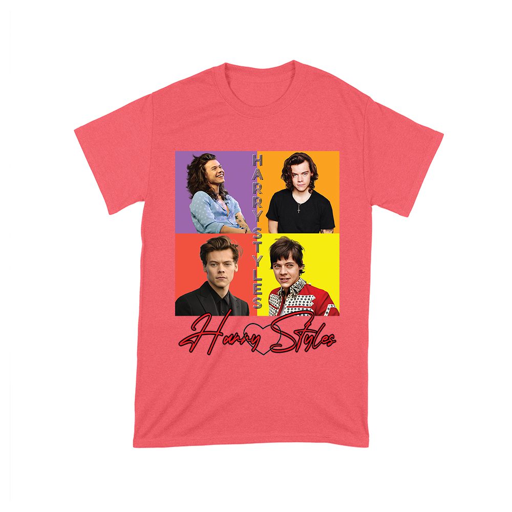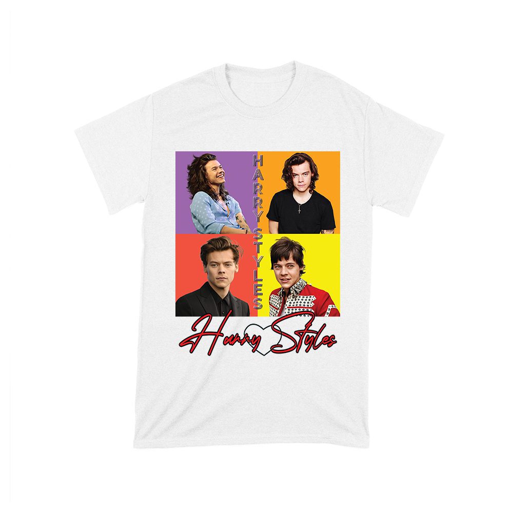 Hary-Styls colorful blocks tee; pop art Harry Styles shirt; graphic print celebrity T-shirt; vibrant retro music shirt; fandom collage tee; bold fan top — perfect for birthdays, parties, and celebrations.