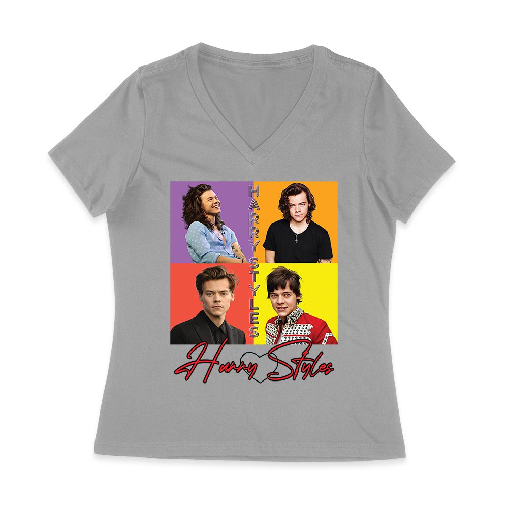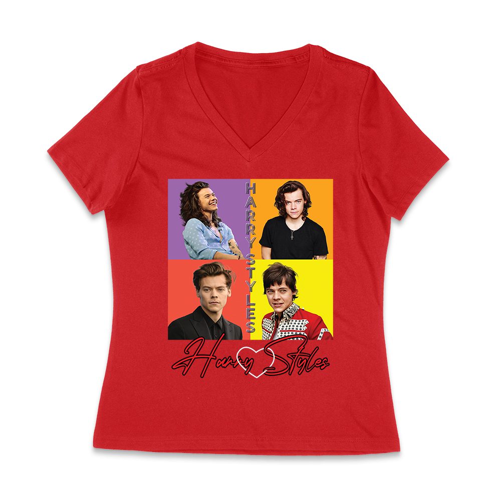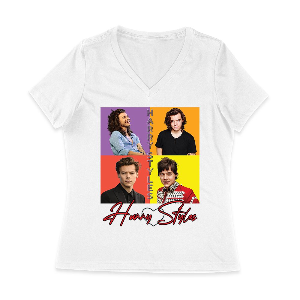 Retro Pop Color Blocks Hary-Styls Graphic T-Shirt for Music Lovers Women Jersey V-Neck