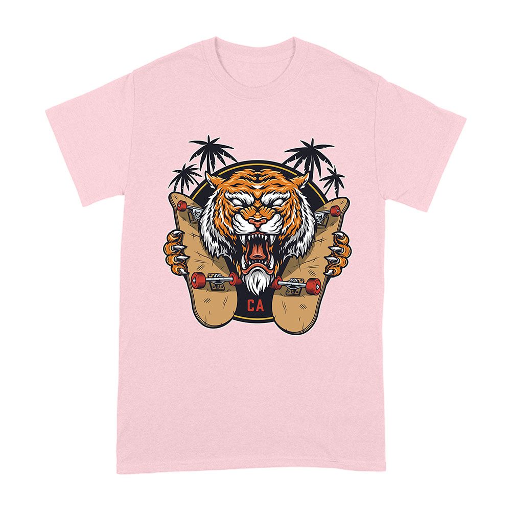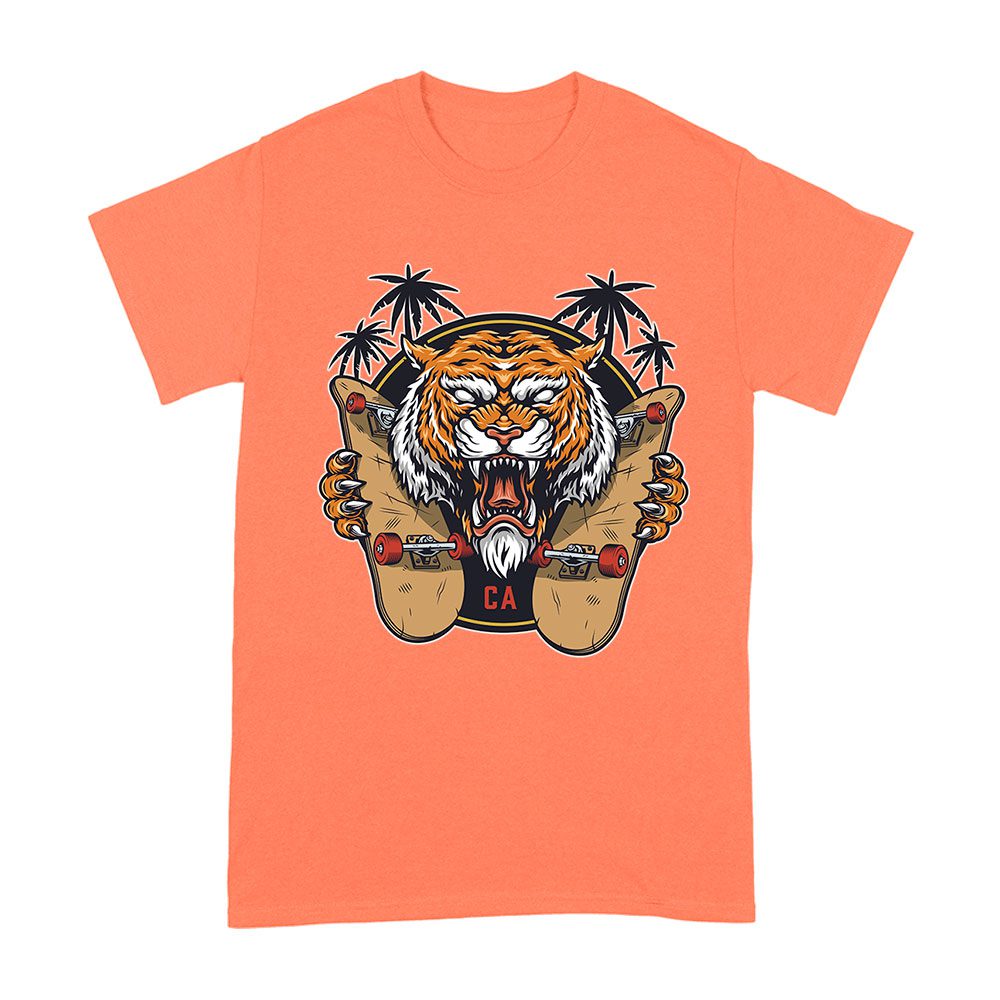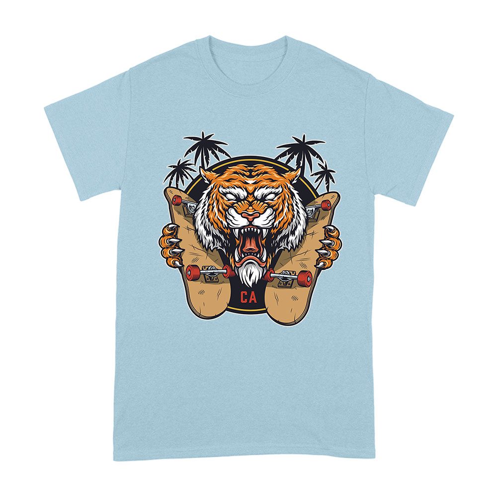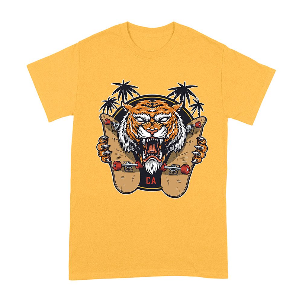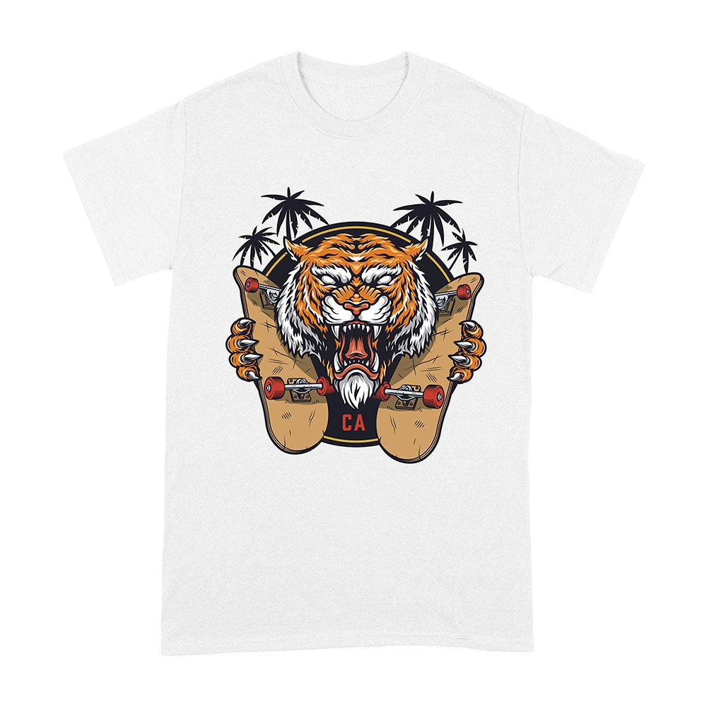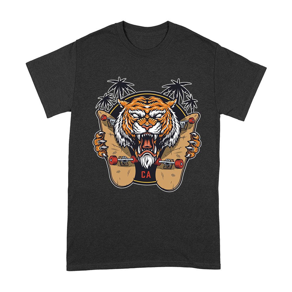 Tiger skate CA, skateboarding tiger, CA graphic tee, urban skate style, tiger board shirt, bold tiger print, skate lover design, tiger skateboarding art, CA skate apparel, fierce tiger tee, skate graphic tiger, streetwear skate shirt: