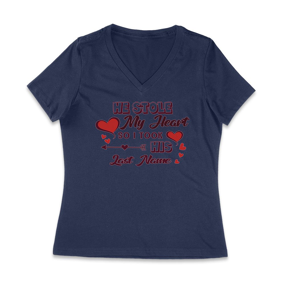 Romantic Valentine T-Shirt – He Stole My Heart So I Took His Last Name Design Women Jersey V-Neck